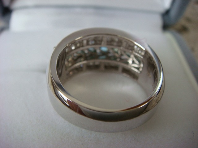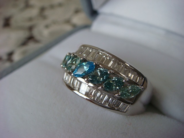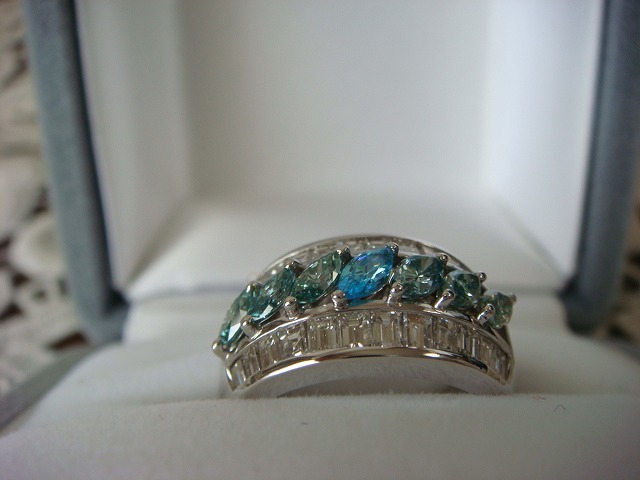 中央の石はブルートパーズです。サイドの6個はブルーダイヤモンドです。爪の部分は18金WGです。