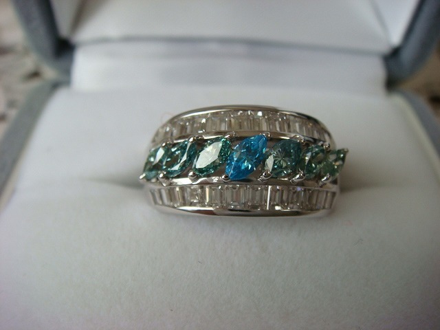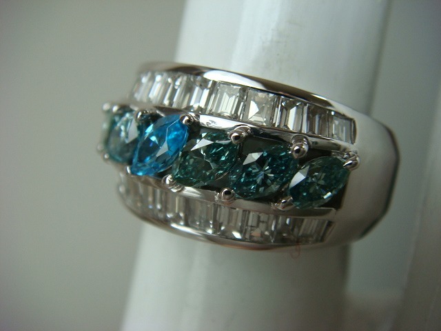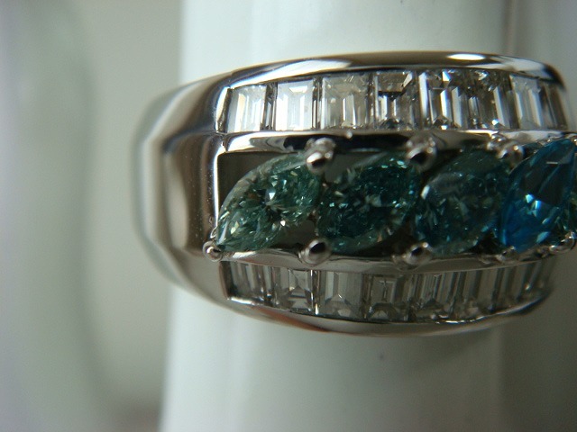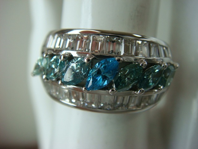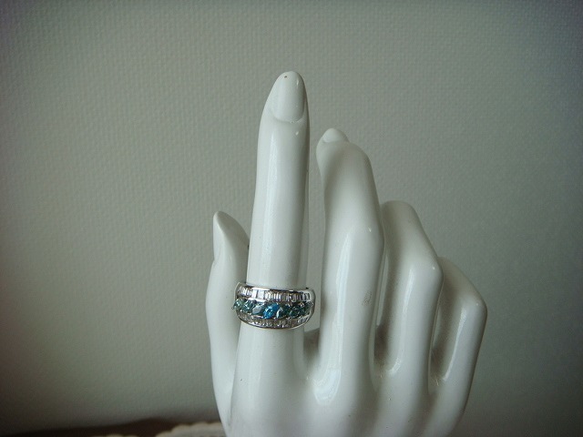 豪華なブルーダイヤモンドとスクエアカットのダイヤを使ったリングです。サイズは約12です。プラチナ製 PT900の刻印入り。