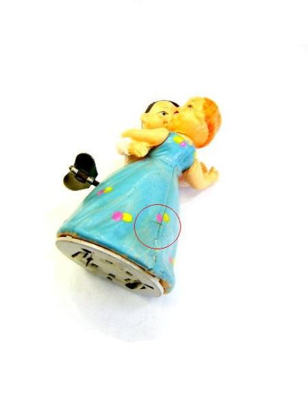 | 商品の紹介 | 1950年代頃のものと思われます。 メーカーは解りかねますが ドレス裾に潰れていますが「JAP」までが 読めるようなエンボスがあります。 色味、作りからして日本製と思われます。 ホデイはセルロイド製 底板のみブリキ製 白のタキシードの腕とドレスから覗いている 女性の腕はしっかりと握られ離れぬように 別パーツの一体成型となっており 片側の各々の腕にゴム繋ぎとなっています。 片側は自由に動きます。 男女の頭部も別パーツで拵え ゴム繋ぎとなっておりますので 向きを自由に変えられようです。 ゼンマイは左巻き また動きは底部に「ツメ」が2本あり 左右にターンを繰り返し滑るような踊りの動きをします。 残念ながらドレス合わせ目付近に ヨコ斜めに1センチ程のヒビがあり、そこから 1センチほどの凹みラインが続いています。(写真3枚目○印参照) 顔にヨゴレ、塗料の付着があります。 セルロイド合せ目、頭部、腕付根口辺りに 製造時型抜き時による若干のホール、筋ムラ、型ムラがあります。 (セルロイド製品に大なり小なりある類のものです。) 写真のものが全てです。 写真でご判断下さる様お願い申し上げます。 ゴムは伸びきっていましたので新しいものに換えてあります。 ゼンマイは生きています。 落札時に出品者からのメッセージが届きますのでご覧下さい。 (マイオークションの通知設定を非通知にしている場合は届きません) メールが届かない場合はお手数ですがご連絡下さい。 落札後のキャンセルはお受けできません。 |