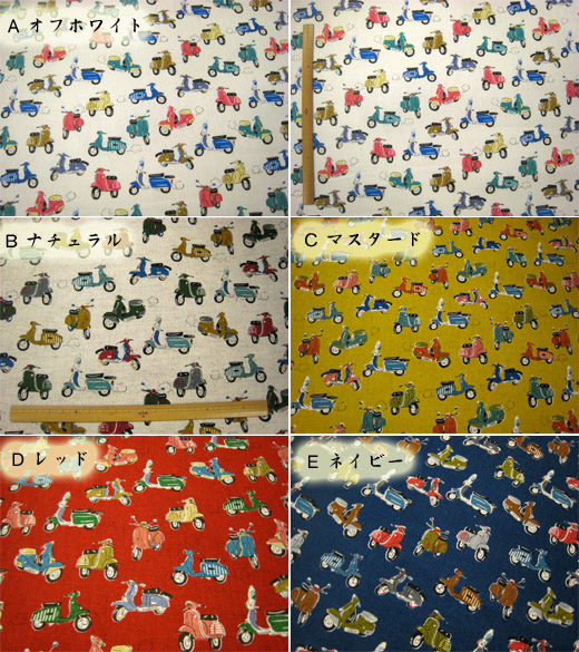 シンプルなデザインがお薦めの乗り物柄。スクーター柄がかわいい仕上がりです。男の子や女の子にもお薦めで、落ち着いた雰囲気もあって大人にもお薦め。生地はやや薄手のキャンバス地、インテリアや小物などに。