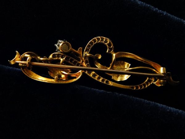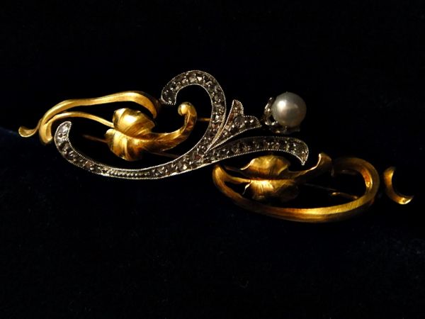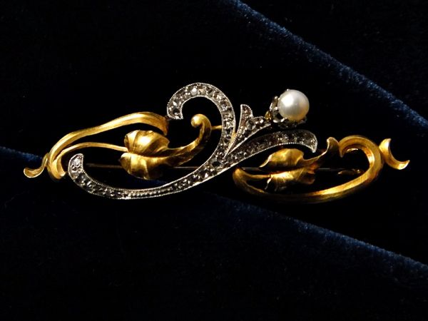 アンティーク アールヌーボー K18 ダイヤモンドと真珠のブローチ 本物保証