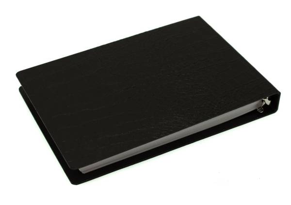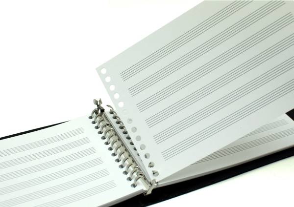 五線紙6段のルーズリーフカード50枚を、リサイクルレザーのバインダーで綴じました。コード進行を書き留めておくメモリーノート用に最適です。