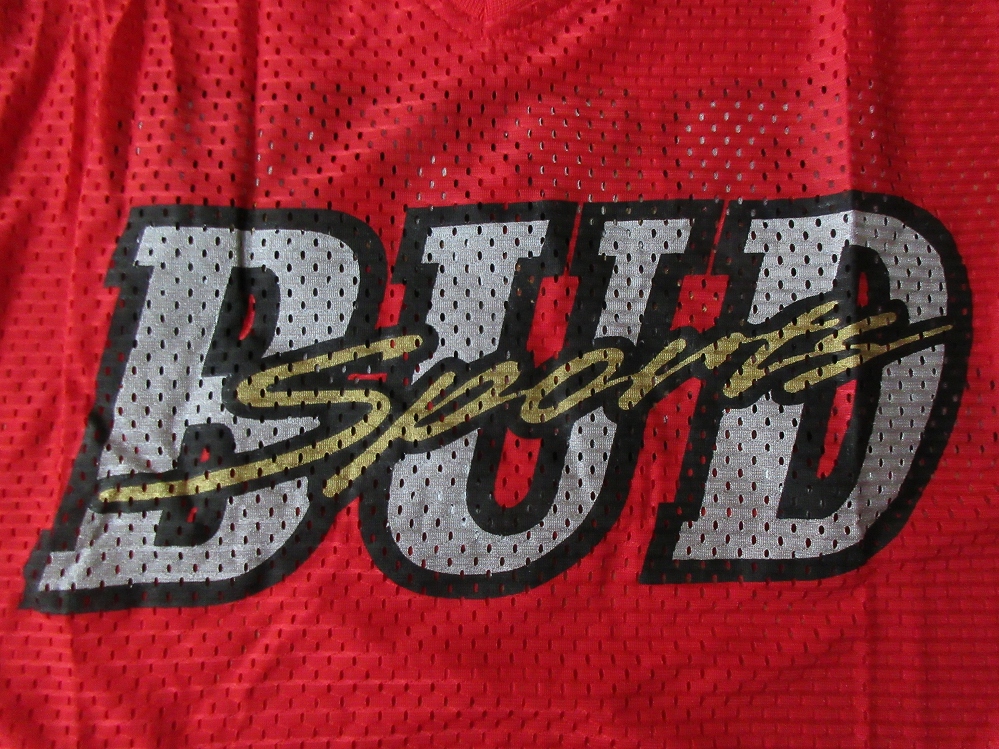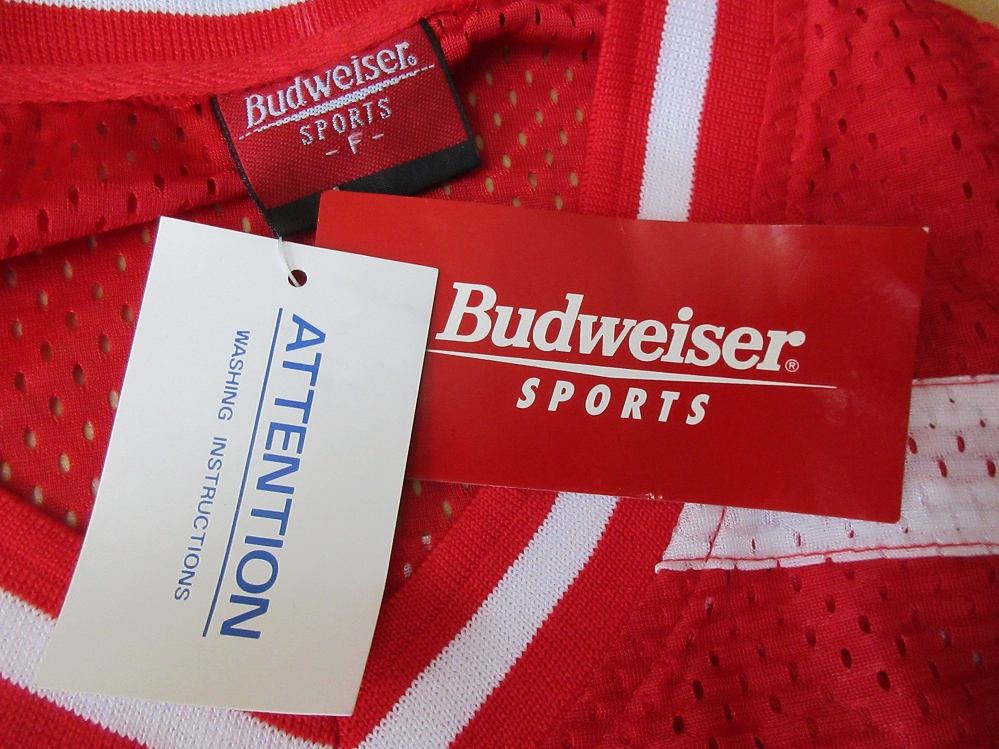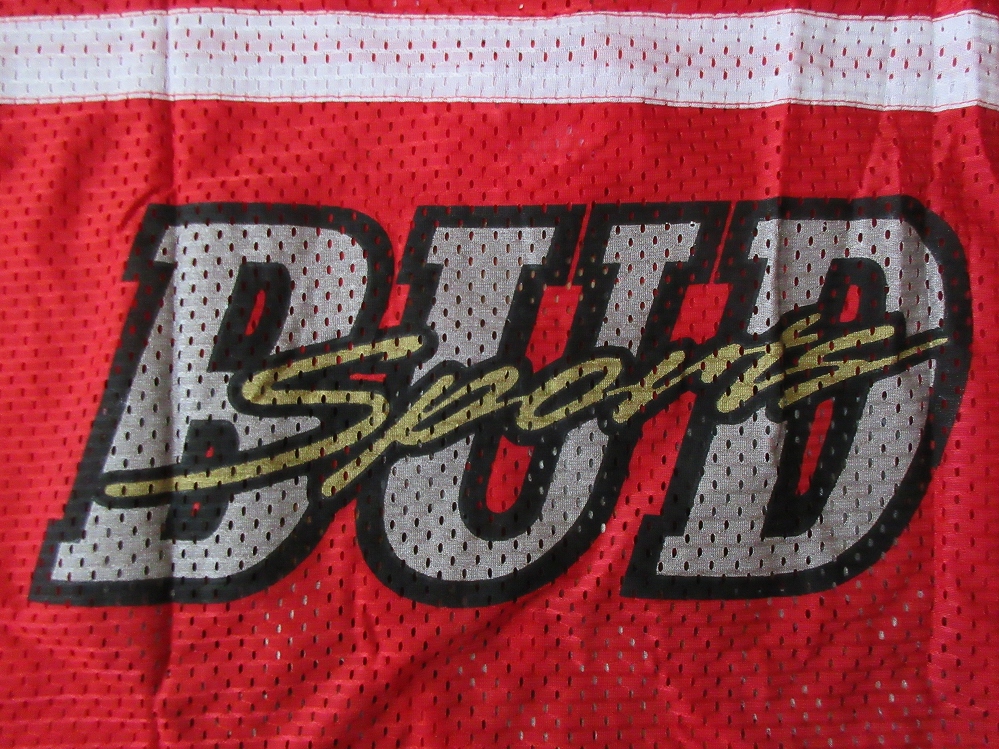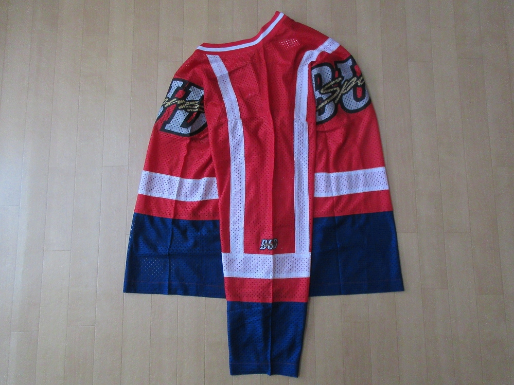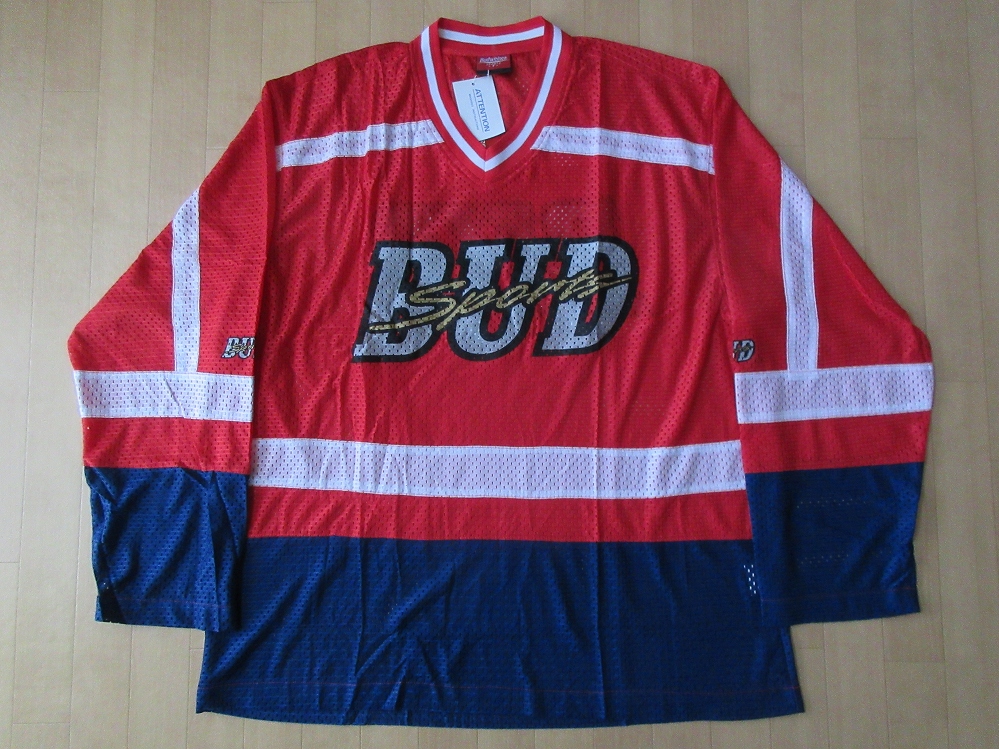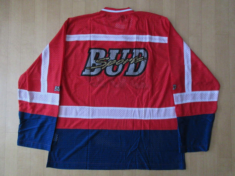 今から20年以上前の、90年代初頭~中期頃にリリースされた、〔Budweiser SPORTS(バドワイザー・スポーツ)〕の、表面、裏面、左右の腕に「BUDのロゴ上に、スクリプトロゴでSports」のグラフィックが施された、〔オールド・ビッグシルエット・薄手メッシュ素材・ホッケーシャツ〕になりますので、現在では大変希少かつ、極めて入手が困難かと思われます。