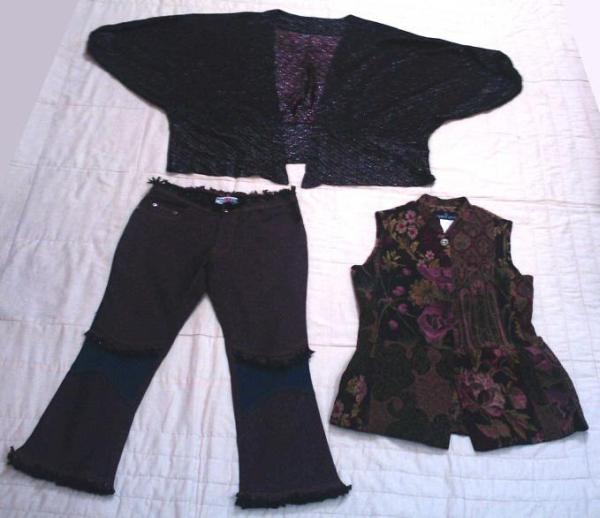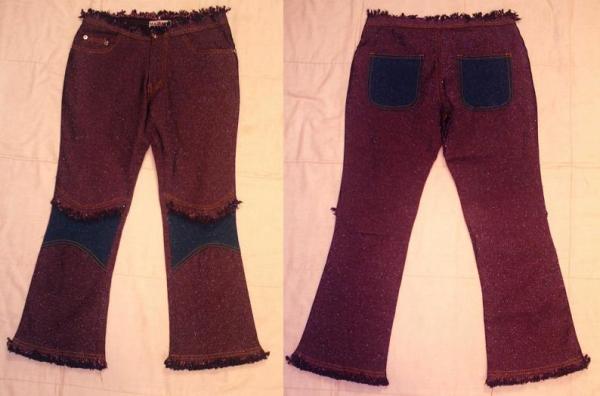 全体にラメ糸が編みこまれてキラキラ光っている素材です。色は紫系で膝とお尻のポケット部分が緑です。