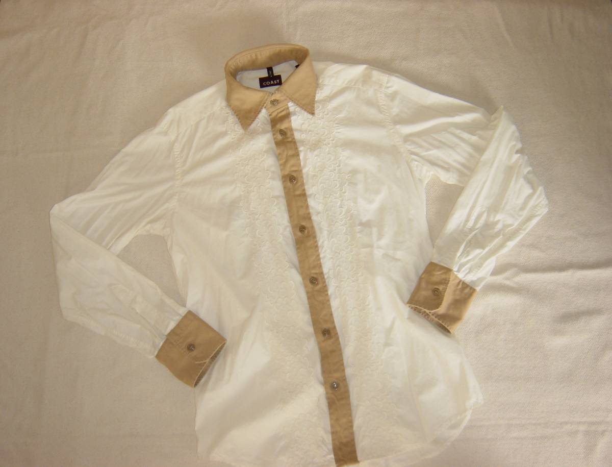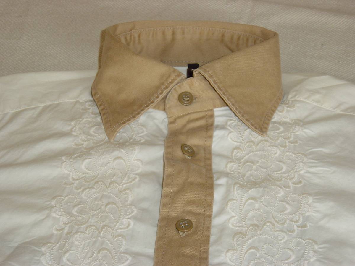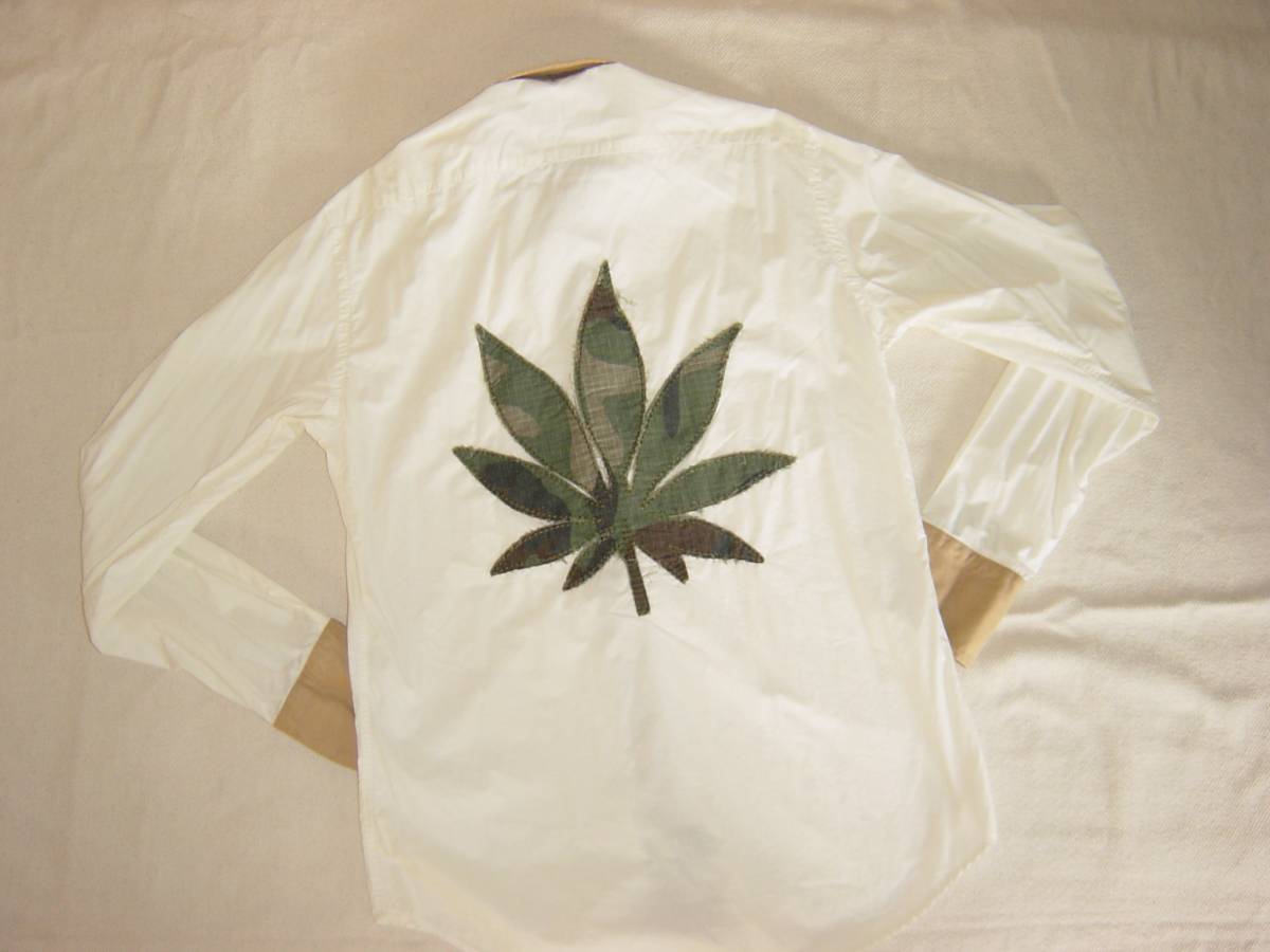 • 色は薄いベージュ、前身ごろの柄は刺繍、背中の葉はパッチワークです。