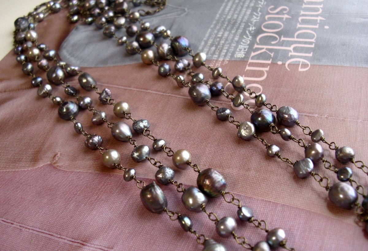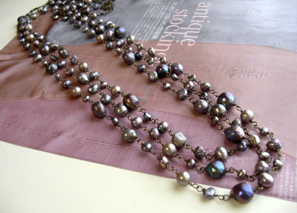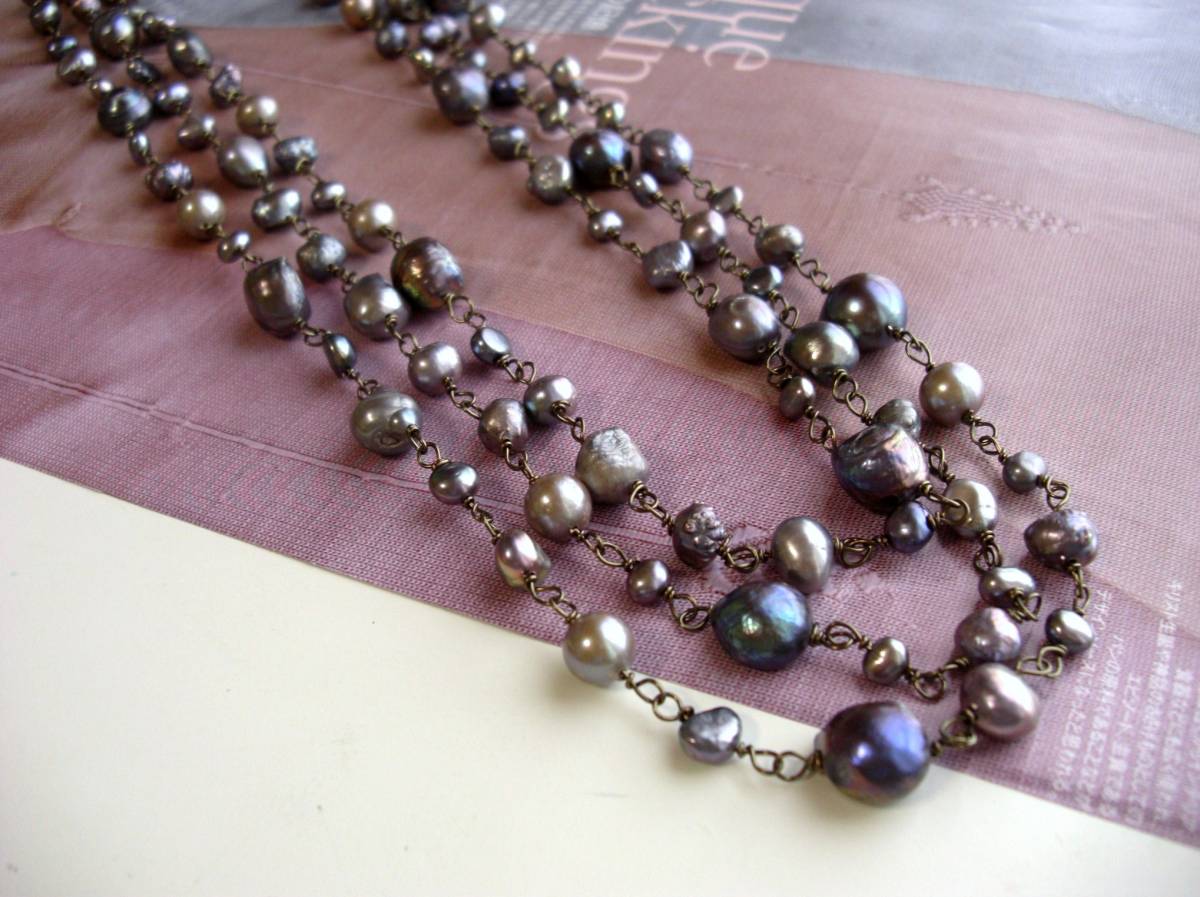 秋色・デッサン・・シリーズです♪パール・レッスン・・個性的なバロックの淡水パールのネックレス3本セットです♪神秘的なグレー系のバロックパールを集めてランダムに繋ぎました♪少しずつ長さを変えたネックレス3本なので3本一緒に重ねたり2本を重ねて1本をぐるぐる巻いてブレスレットにと色々な組み合わせで楽しんでいただけます♪バロックパールは6ミリから12ミリ位までの大きさ違いです♪長さは96センチ、94センチ、90センチ位の長さ違いでそれぞれ調節自由です♪2本セットや単品、お揃いのピアスも出品しています♪ハンドメイドを ご理解頂いてノークレーム、ノーリターンでお願いします
