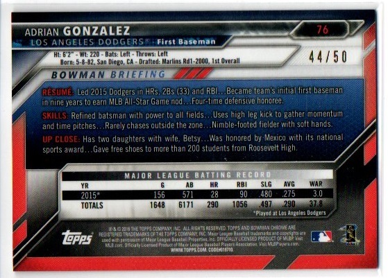 【ADRIAN GONZALEZ】2016 Bowman Chrome Gold Refractors #76 [44/50]