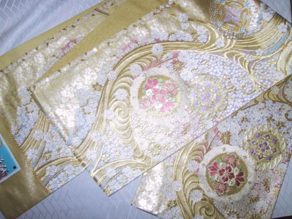 京都西陣 じゅらく の 若向きよう(振袖、訪問着、付け下げ、無地、小紋、など向き)のTOPブランド品『花かるた(花かおり,いろあそび)』ブランドです。6通柄袋帯 新品未仕立て品、絹100%金属糸等使用  薄金茶色地に銀色のの生地に 華紋に水紋にあつまる小花、、、