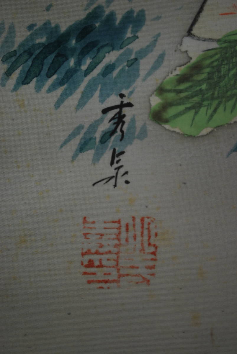 【作品状態】 本紙は絹本肉筆です。  本紙は薄汚れ、多少の糊シミあります。表装は天地に多数の糊シミあります。