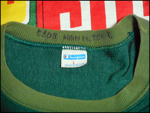 ★希少なエルボーパッチ付きの1枚★Made in USA製アメリカ製ChampionチャンピオンビンテージナンバリングフットボールTシャツ70sバータグ緑