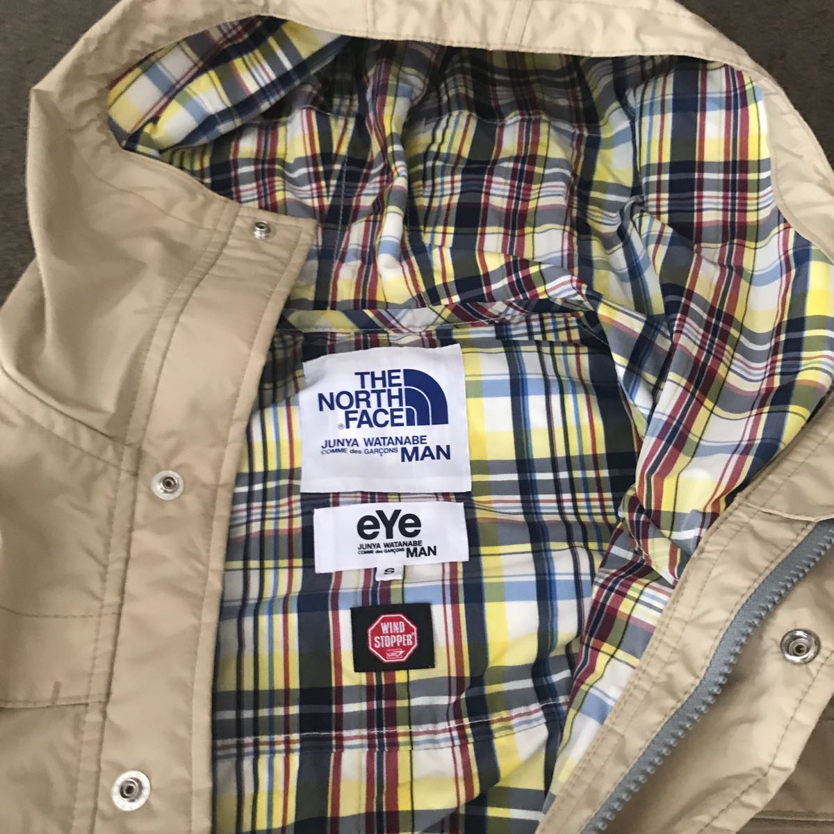 数回着用 ジュンヤ ワタナベノースフェイスコートです。Sサイズ、ナイロン100%です。ウィンドストッパーモデルです。友人からもらったサンプルモデルで、品質表示はありませんが、正規品です。探していた方、この機会に如何ですか。