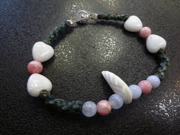 ☆ホワイトシェル羽、ホワイトジェードハート、インカローズ、ブルーレースアゲードの高品質のマクラメブレスレット商品です。
