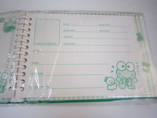 | けろけろけろっぴ プロフィールノート(自己紹介帳)です。 新品未開封品。 1990年製の古いお品です。 長期保管品をご理解ください。 けろっぴがお好きな方、いかがでしょうか。 個人の保管品の為、神経質な方はご入札をお控えください。 | |