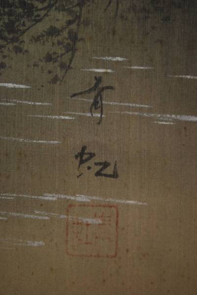 【作品状態】 本紙は絹本肉筆です。 本紙は時代焼け、全体に汚れシミあります。表装は時代焼け、天地に多数の汚れシミ、時代焼けによる色ムラ、耳切れ補修痕、風帯の欠損、糊シミなどあります。状態は悪いです。