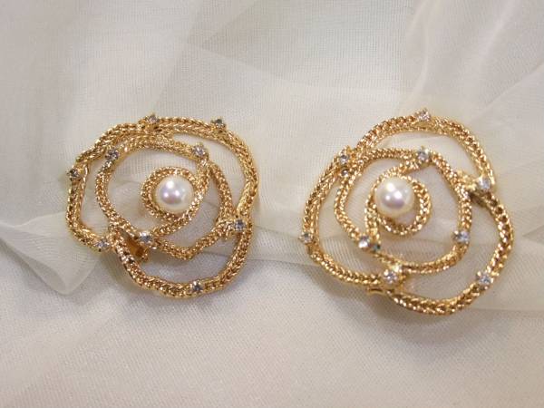 画像の、古いコスチュームジュエリーのフェイクパールを使ったイヤリングです☆このシリーズは、ユーロ製や、本場米国製、または、それらの国に輸出用に古い時代日本で作られたもの、のいずれかです。最近の安いものとは違って、メタルも鍍金もフェイクパールも美しいです。(おそらくは大半が真鍮製、もしくは錫など合金メタルです)古いコレクションなので、お素材ははっきりとは分かりませんが、どれもとてもデザインもゴージャスでお素材も良く素敵と思います☆古いものなので相応の経年感や、金具など堅い場合や、滑り止めのシリコンゴムが別途必要な場合もありますこと、その旨、ご了承いただいた上でご入札ください☆