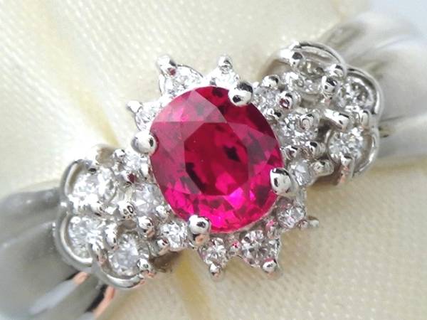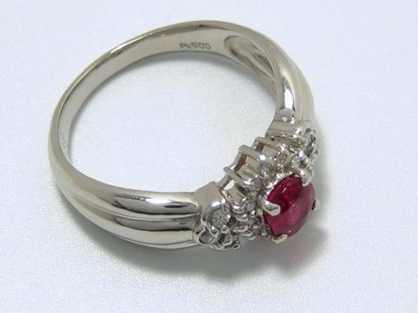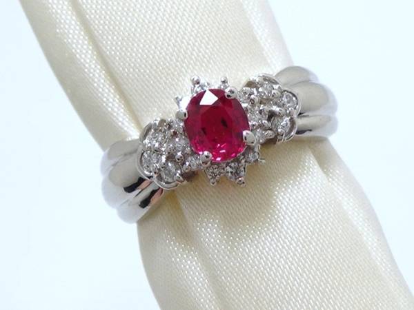 素材はPt900、ルビー0.59、ダイヤ0.17ct、指のサイズ13号、リング幅9.2ミリ、高さ5.5ミリ、重さ7グラム、ルビーの大きさ5.2×4.5ミリほどです。目立つインクルージョンなく、周りのダイヤも綺麗な輝きです。底から湧き上がるような綺麗な赤色です。透明すぎたり詰まりすぎたりしていません。良かったら、この機会にぜひどうぞ。
