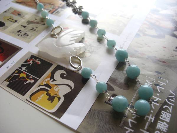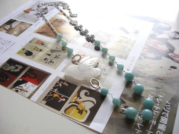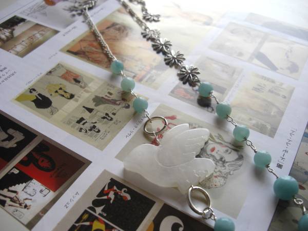 大人可愛い・セレクト・・シリーズです♪アンニュイ気分・・爽やかな水色のアマゾナイトと大きな鳥さんのロマンチックなネックレスです♪パリ(??)っぽいアンティークな雰 囲気で作りました8ミリ、10ミリの丸玉のアマゾナイトにホワイトジェイドの鳥さんや小花のチャームを合わせました♪鳥さんは40×32ミリ位です。長さは全長85センチ位で調節自由です♪飽きのこないいつまでも着け られるデザインを考えて作りました!お揃いのブレスレットも出品しています♪ハンドメイドをご理解頂いてノークレーム、ノーリターンでお願いします