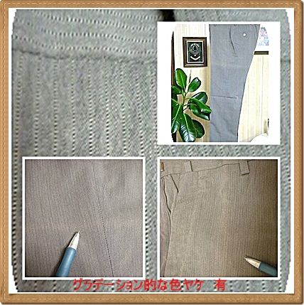 上品セレブの個性的モード派シャドーチョークストライプ織柄のカジュアルパンツです。ウエストにバックスリット フロントにコイン(ウオッチ)ポケット付きのこだわりデザイン そして ノータックパンツです。しゃきっとした薄地素材は 綿混細糸使用のはき心地の良い生地です。色は 上品なカーキがかったモスグレー色の薄地です。実測平置サイズ ウエスト 82cm 渡り幅 32,5cm 腿幅(股下 10cmの所) 29,5cm 裾幅 21cm 前股上 23,5cm 股下(フリー状態) 88cmです。勿論 新品ですので、ご希望どおりの長さ等で裾上げして、着用して頂けます。 こちらは 某有名メーカー品ゆえ メーカー配慮の為 ネームタグ等は取り外してあります。それ故 超安値の処分価格スタートとなります。よって お買い得となっております。 また ただ 三番目画像で示す様に 折り目部分 等に色ヤケ有りのジャンク品です。こちらは ジャンク度が高いです。普段着 仕事衣 等としても ご活用下さい。 ただ、当商品はダメージユーズド感覚で着て 着込んだ感じを出す方が こなれたオシャレですので 逆に シワとか そのダメージを利用してみては如何でしょうか? ダメージ感覚で着用するラフカジュアルパンツゆえ 賢くオシャレに ご着用下さい。そして、ジャンク度レベルによってスタート価格が違います。 尚 毎週 木 日曜日は業務定休日で御座います。ご連絡御発送とも休業日明けにずれ込む事御了承下さい。 以上宜しくお願い申し上げます。