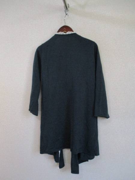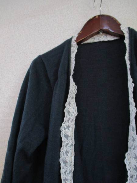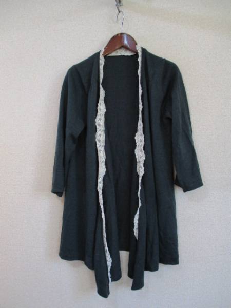 | 商品紹介 | 襟周りから前の端に付いたレースがポイントになった7分袖カーディガンです。 前は開いた形で、前裾が長いデザインになっています。 本体は深緑です。 《素材》 本体:アクリル80% ナイロン15% 毛5% レース部分:綿80% ナイロン20% |