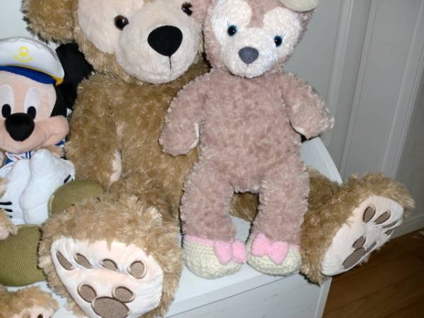 我が家のシェリーメイは立つことができませんので、ダッフィーを支えに画像を撮っています。出品はルームシューズのみです。画像のぬいぐるみ・その他の付属品はありあません。