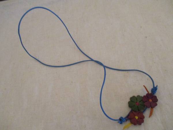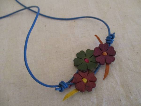 商品紹介 | 緑と赤のレザー花モチーフに青の首紐が可愛いネックレスです。 紐の長さを自由に調整することもでき、花モチーフも動かせるので、好みで様々な形に自由に変えることができます。 |