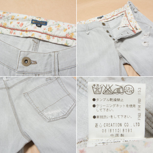 全体的には状態は良好ですがバックポケット右側部分に1ミリ程度のシミが御座います。着用に際して大きく目立つ印象では御座いません。