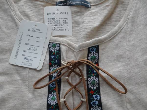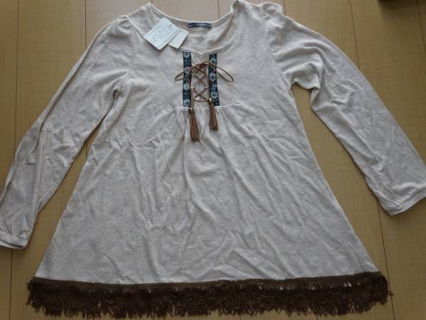 新品未使用のmignonのチュニックになります。 ウエスタン風のデザインでおしゃれなチュニックです。 胸部の編上げと裾のフリンジ使いがかわいく、きれいなラインを出してくれます。 色・・・薄いベージュ色×茶色 サイズ・・・ M 平置き採寸 : 着丈 69cm 身幅 48cm 袖丈60cm |