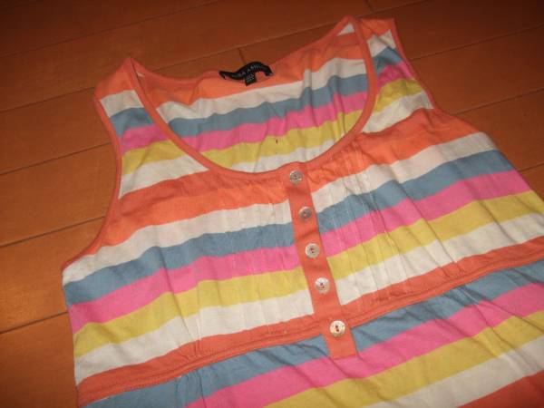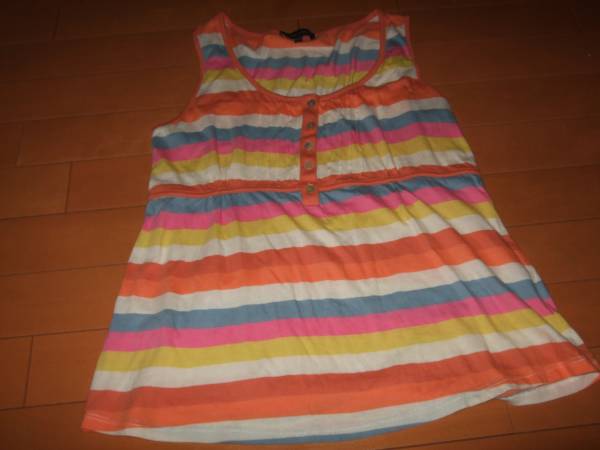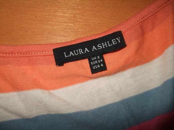 良品、ですが多少ユーズド感、色あせ感うっすらとありますのでご了承ください。普通に外でも着用いただける程度のユーズド感です。ローラアシュレイのカラフルなボーダーノースリーブカットソー、サイズはヨーロッパサイズ34、イギリスサイズ8アメリカサイズ4です。きれいな明るい元気の出る色合いで、デニムなんかともよく合います。身幅約42.5、丈約56、即決です。夏のデイリーユースにぜひご検討ください。