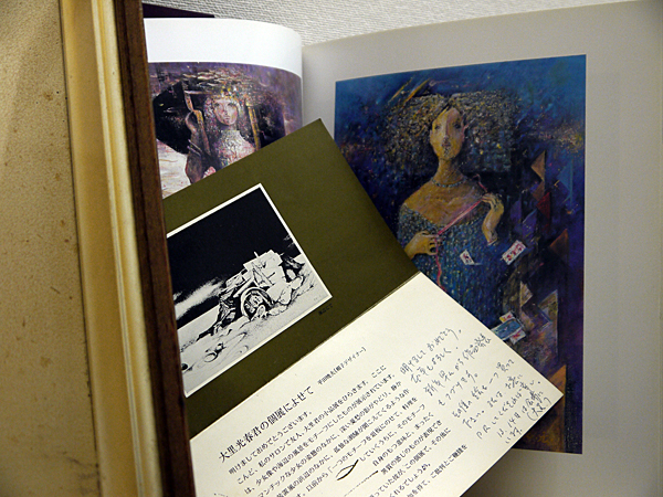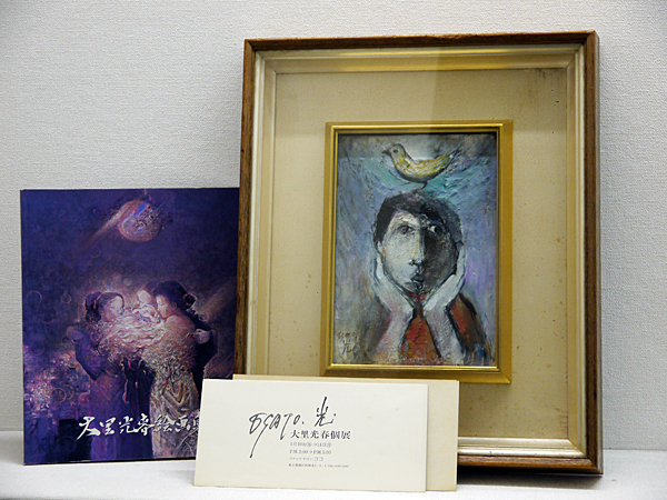 一部上場企業ファナックがパトロンとして有名な大里光春氏の子供を描いたシリーズの中のサムホール作品。希少で立派な画集と顧客に個展での作品購入を依頼する大変珍しいメッセージが書き添えられた案内状が付いています。