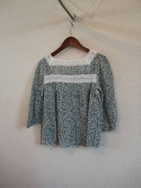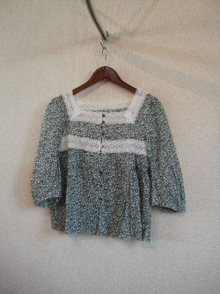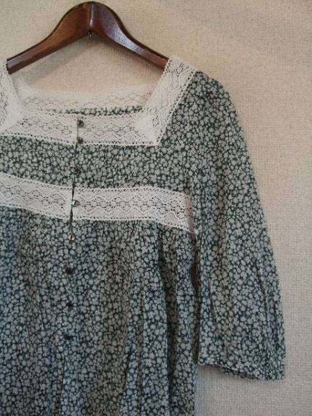 | 商品紹介 | 白い小花柄がプリントされた7分袖ブラウスです。 襟元と胸下のレースがポイントになっています。 レースとレースの間には縦にピンタックが入っていて、 下のレースからはギャザーでふんわりとした形になっています。 地色は深緑、プリントトレースは白です。 前のボタンはループで留めるようになっています。 《素材》 綿100% |