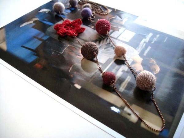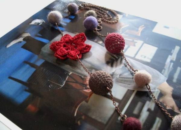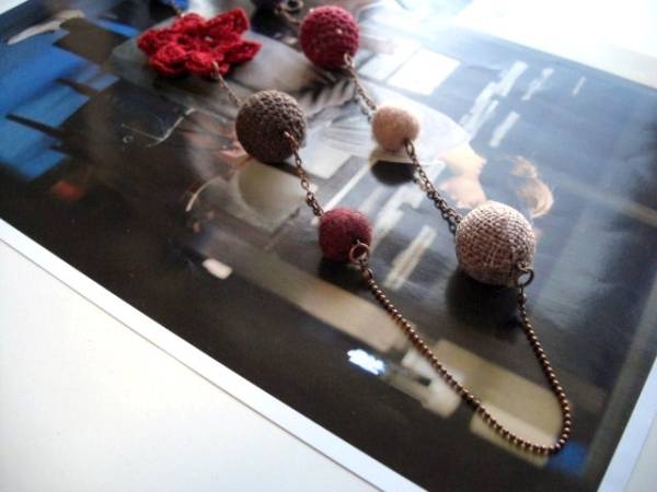 天使の贈り物・・シリーズです♪やさしい色を集めて・・フェルト玉や編みフラワーなど異素材を集めたネックレスです♪12ミリから46ミリ位までのダークブラウン、モスブラウンや レッドなどのフェルト玉や編みボールや編みフラワーを合わせて大人のロマンチック しています♪ネックレスの長さは95センチ+アジャスター13センチで最長108センチ位です♪2連にされても素敵です♪お揃いのブレスレットも出品しています♪ハンドメイド をご理解いただいてノークレーム・ノーリターンでお願いします♪