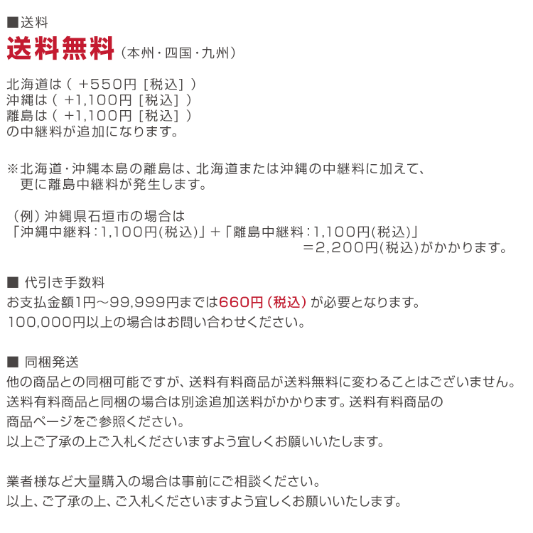 ▼ 商品に関するお問い合わせはこちら ■対応時間 10:00~15:00 土日祝日休業 ※ 商品に関するお問い合わせや初期不良等のご連絡はやり取りの履歴を残すために、 お手数ではございますが、必ず下記のメールアドレスにご連絡ください。 pickup_plaza@yahoo.co.jp ▼ 営業日・支払い方法・発送・返品・交換・保証に関して ※必ずお読みください 営業日・支払い方法・お届けについて・返品・交換・保証に関する件は、以下のページにて詳しく記載しております。 営業日掲載ページはこちら 営業日カレンダー掲載ページ 支払い方法・お届けについて・返品・交換・保証に関する掲載ページはこちら お買い物ガイド詳細ページ プライバシーポリシーに関する掲載ページはこちら プライバシーポリシー記載ページ ▼ 質問が多かった即決落札について 即決で落札する方法 即決で落札するには ├PC版の場合は、商品画像右の「今すぐ落札する」をクリックします。 └スマホ版の場合は、(1)「入札する」をタップします→(2)最高入札額記入欄に、即決の金額(税抜)をご記入頂ければ即決できます。 入札→即決落札した場合の履歴に関して ご入札頂いているYahoo_IDで即決価格で再度ご落札して頂ければ、前の入札の履歴は残りますが前の分はキャンセルとなり、即決価格のみでのご落札となります。重複しませんのでご安心ください。 ▼ オークションに関して 入札後の各種確認メールについて 当店からの受注確認メール・入金確認メール・発送確認メールが「迷惑メールフォルダ」に自動で振り分ける場合がございます。 「フォルダを空にする」前にメールが届いているか一度ご確認ください。 ご落札の際は、以下3つの当店メールアドレスが届くように受信設定をお願いいたします。 pickup_plaza@yahoo.co.jp xvshs74272@yahoo.co.jp 当店からの各種確認メールは、オーダーフォームに登録のメールアドレス宛に送信されます。 取引方法 手渡しでの直接取引には対応できません。物流業務を委託していますので、 お近くにお住まいの方でも商品のお受け取りに来ていただくことはできません。 在庫について 当社では、卸販売など各方面でも商品を同時販売しております。 在庫情報は随時更新(新規出品の停止、個数少数での出品、出品取り消しなど)させて頂いておりますが、ご落札頂いた際に時間差などで売り切れになる場合もございます。 予めご了承ください。 キャンセル 入札後のキャンセルは一切お受けできません。 やむを得ぬ事情により落札後キャンセルをされる場合には、落札者都合によるキャンセルとなり、 オークションのシステム上自動的に落札者にマイナス評価がつきます。 ご了承ください。 落札後3日以内にご連絡が取り合えないお客様についてはやむを得ずキャンセル処理をさせていただく場合もあります。 交換返品返金について お客様都合での、交換・返品・返金は一切対応できません。 商品の価格について 当サイトでは、正確な価格表示に努めておりますが、万が一表示価格やご注文商品の金額に誤りがあった場合、誤表記を理由にご注文を取り消させていただくことがございます。 取り消しに際し、お客様にはメールにて販売価格をお知らせしご注文を継続されるか否かのご確認をさせていただきます。 なお、これによりお客様にご不便やご迷惑をおかけした場合でも、直接的または間接的な損害についての補償は致しかねますことを、何卒ご理解のほどお願い申し上げます。 評価について 著しく評価の悪い方の入札はご遠慮願います。 領収書発行について 商品代引きご利用の場合は、伝票が領収書となりますので、別途領収書の発行はできません。 領収書発行希望のお客様は入札後、オーダーフォーム要望欄に必ず「領収書発行希望」をご記入の上ご連絡ください。 |