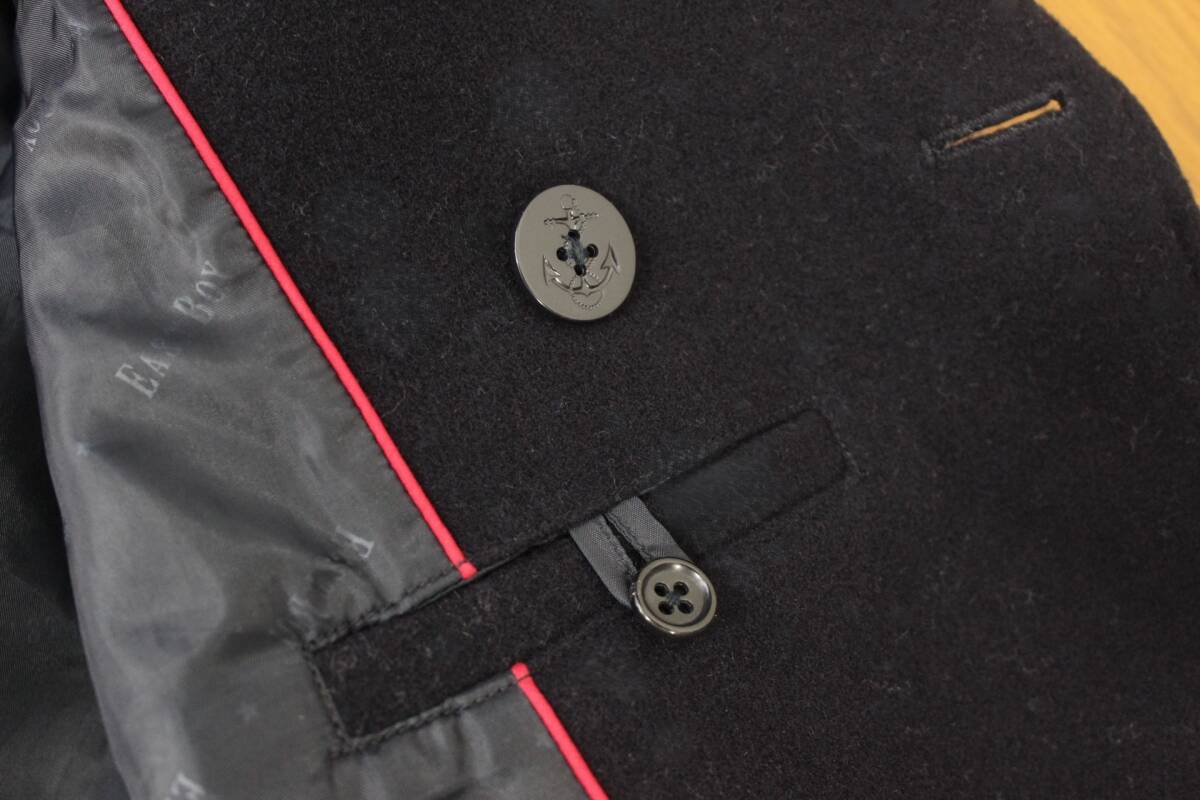 裏地は光沢のあるネイビーで,左胸に便利な内ポケット付き。内側の見返しの部分には,赤のバイピングがあしらわれています。