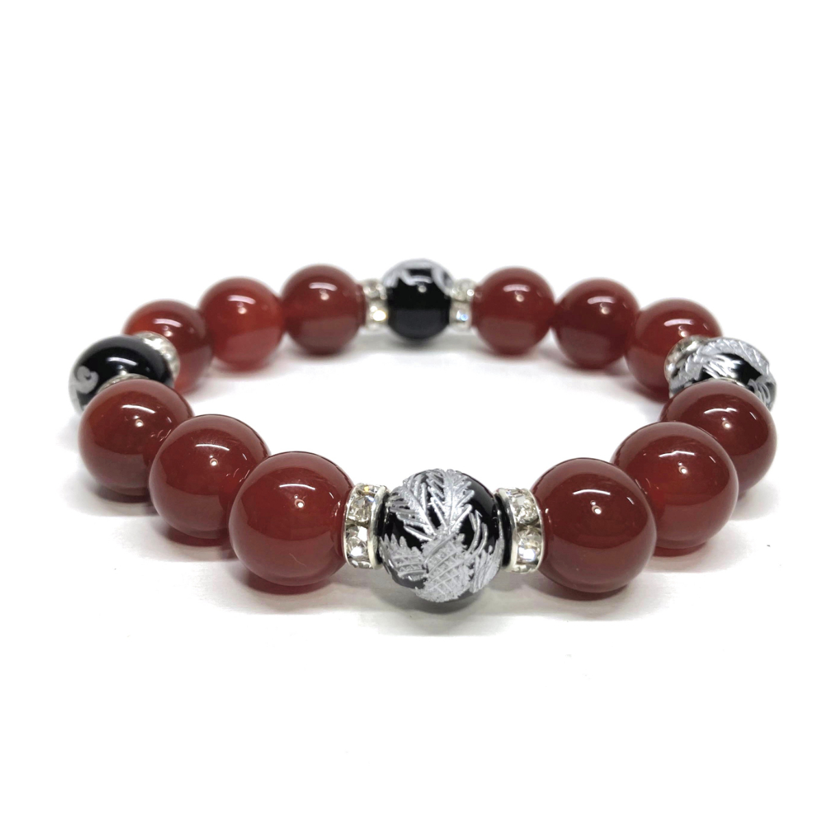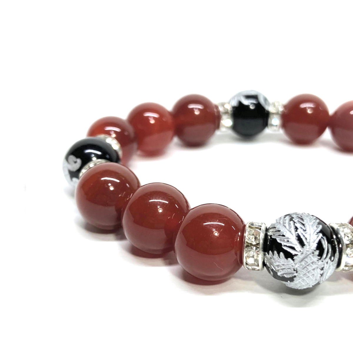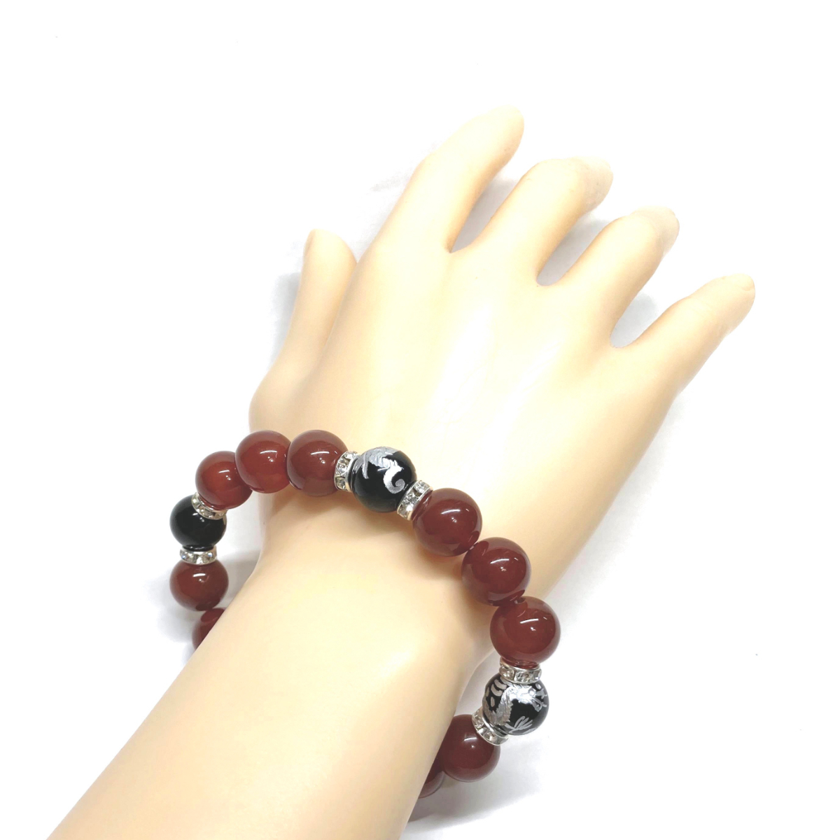 こちらは、四神獣銀彫オニキと赤瑪瑙を組み合わせたパワーストーンブレスレットです。四神獣は、中国の伝説で4つの方向(東西南北)を守護する神聖な神。四神獣、厄災から身を守り、多くの運気を呼び込むと言われております。石大きさは程よくインパクトのある12mm玉で内周 約17cmです。 数に限りがございますので気になる方はお早めにどうぞ。