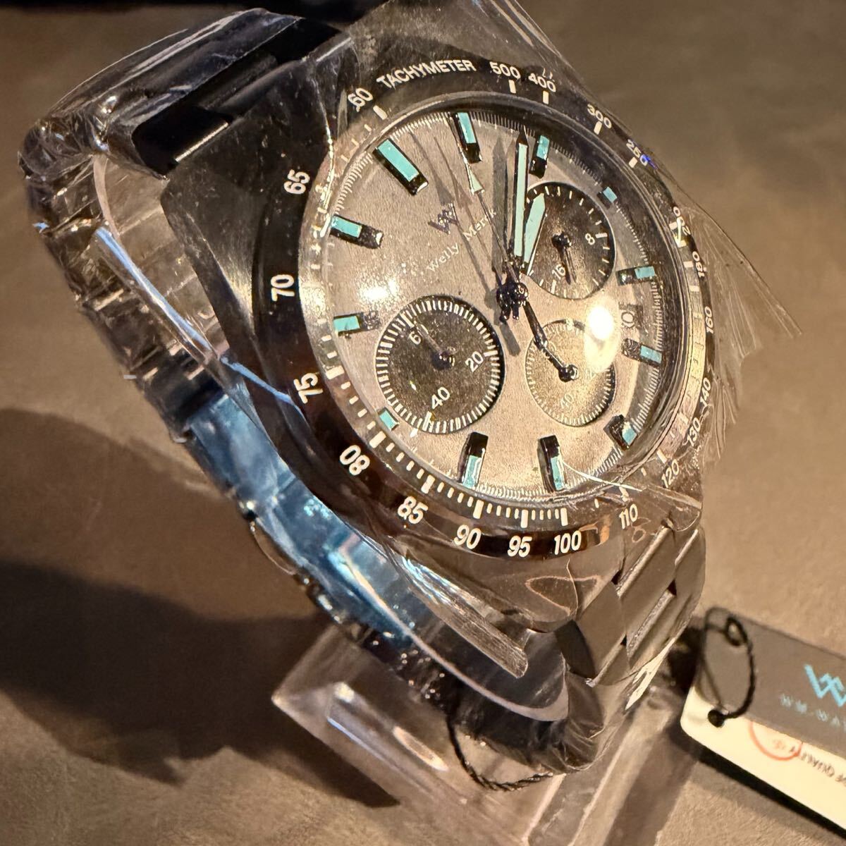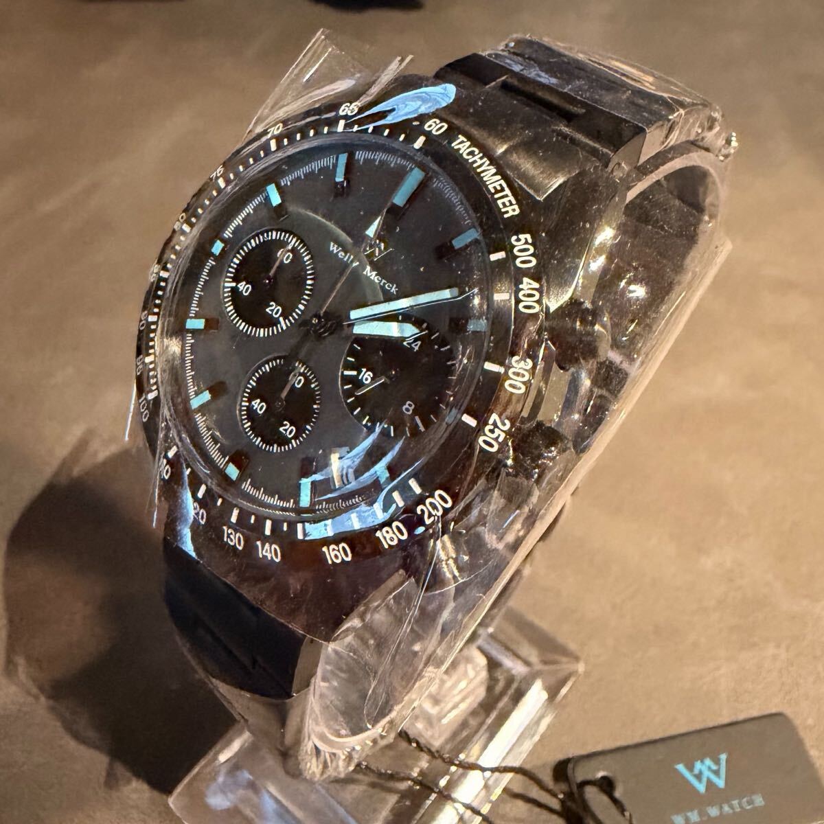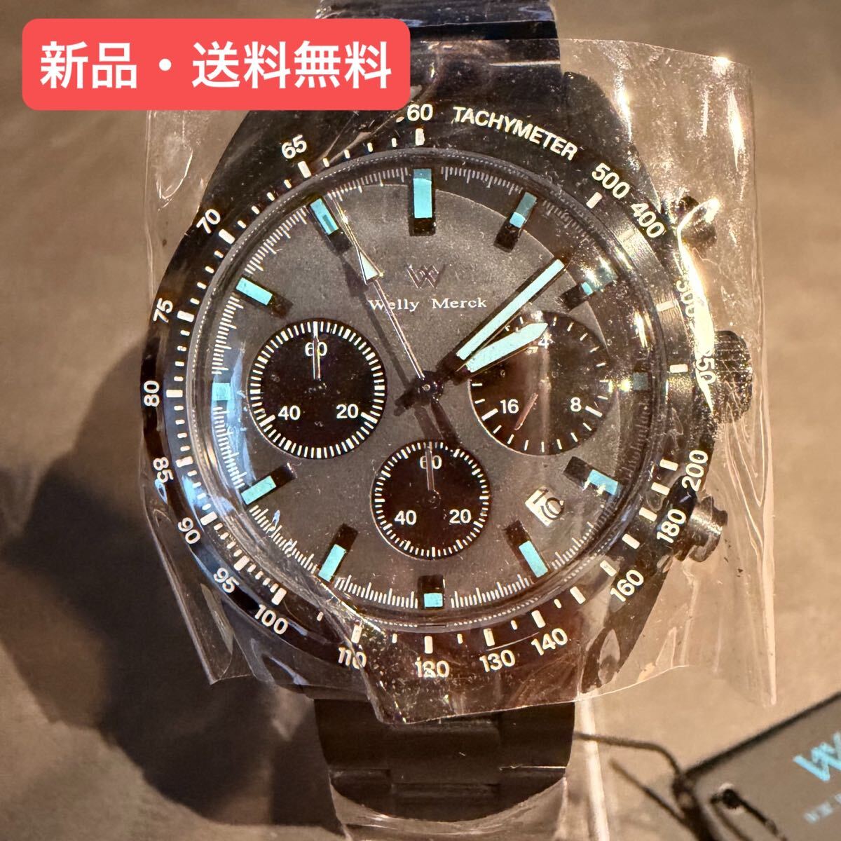 本モデル「176M」は、黒を基調にメタリックブルーの差し色が映えるスタイリッシュなクロノグラフです。