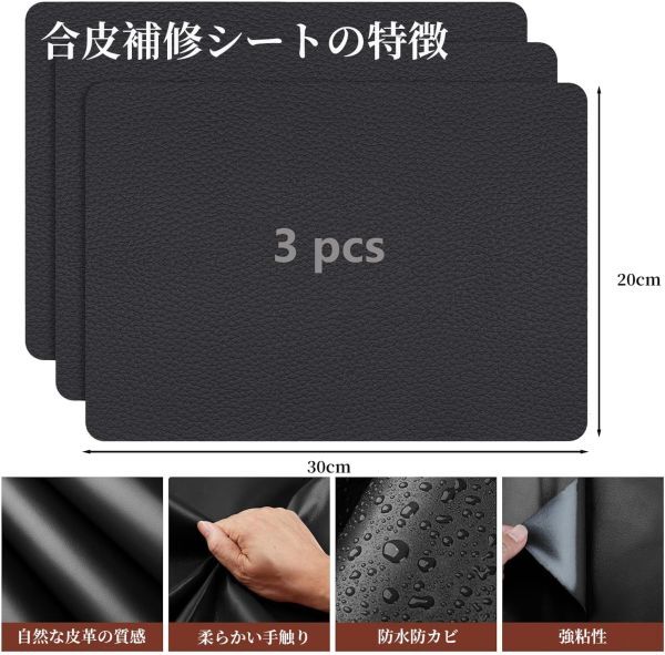 合皮 補修シート20CM×30CM 3枚セットレザー補修シート ソファー DIY 補修布 初心者向け 3枚セット (ブラック) 新品未使用品になります。