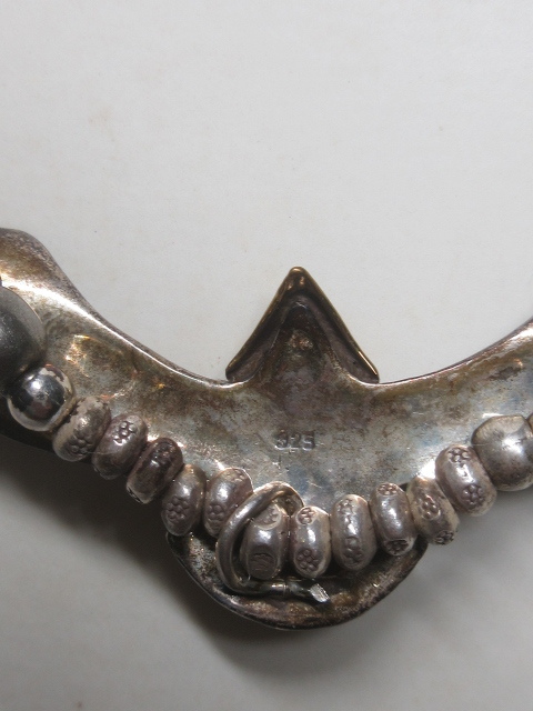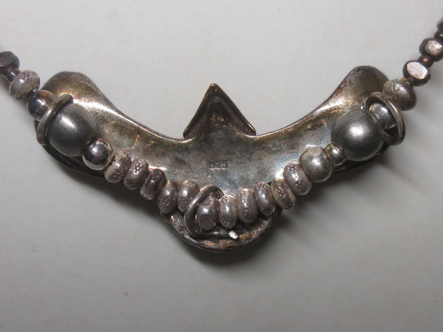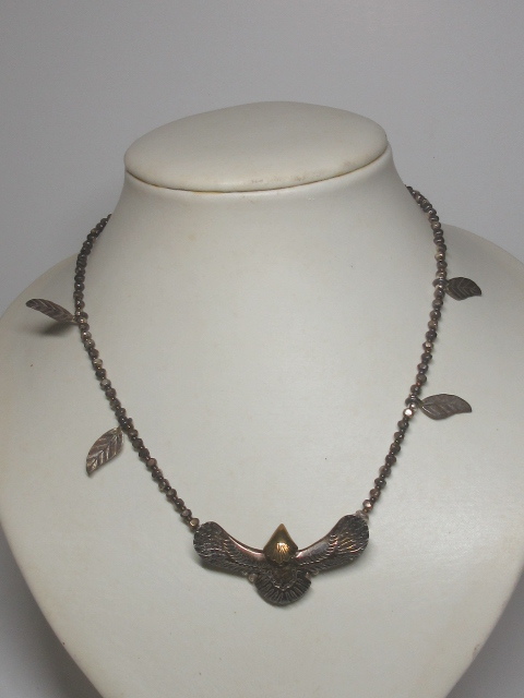 ・ 眼を見張るほどに美しい、アンティークのネックレスです。 ネイティブアメリカンのイーグルデザイン。 出品者がステンレスワイヤーと純銀パーツで組み上げ、イーグルで隠れた部分まで純銀玉パーツがぎっしり、もちろん世界で一点物です。 現在アンティーク小物の人気が高まっているので、これからますます価値が高まっていくと思います。