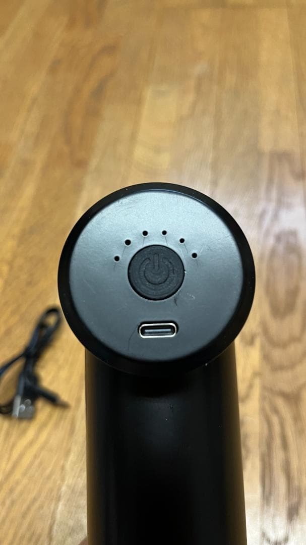 USB-C充電対応、ゴールド装飾のブラックハンディマッサージガン。