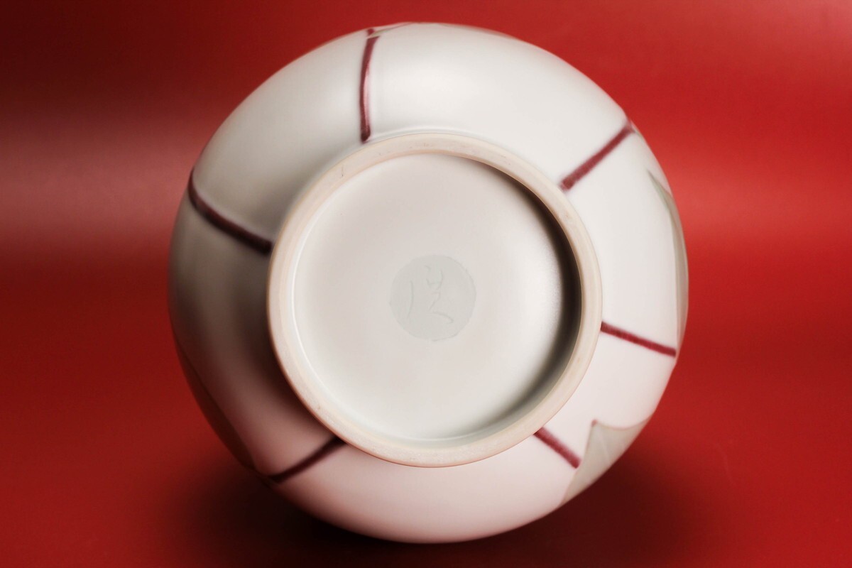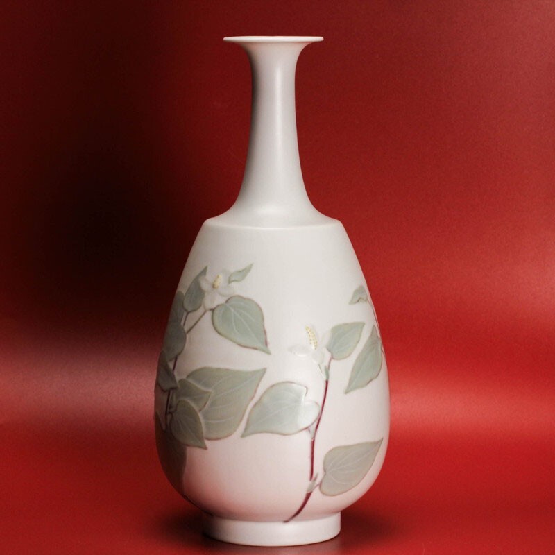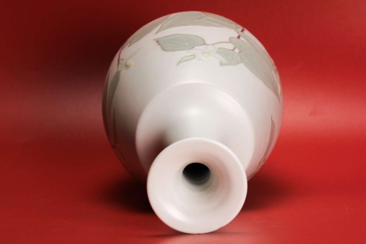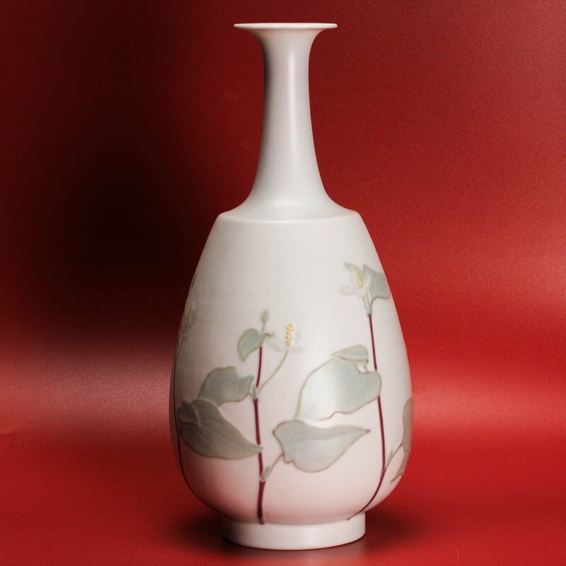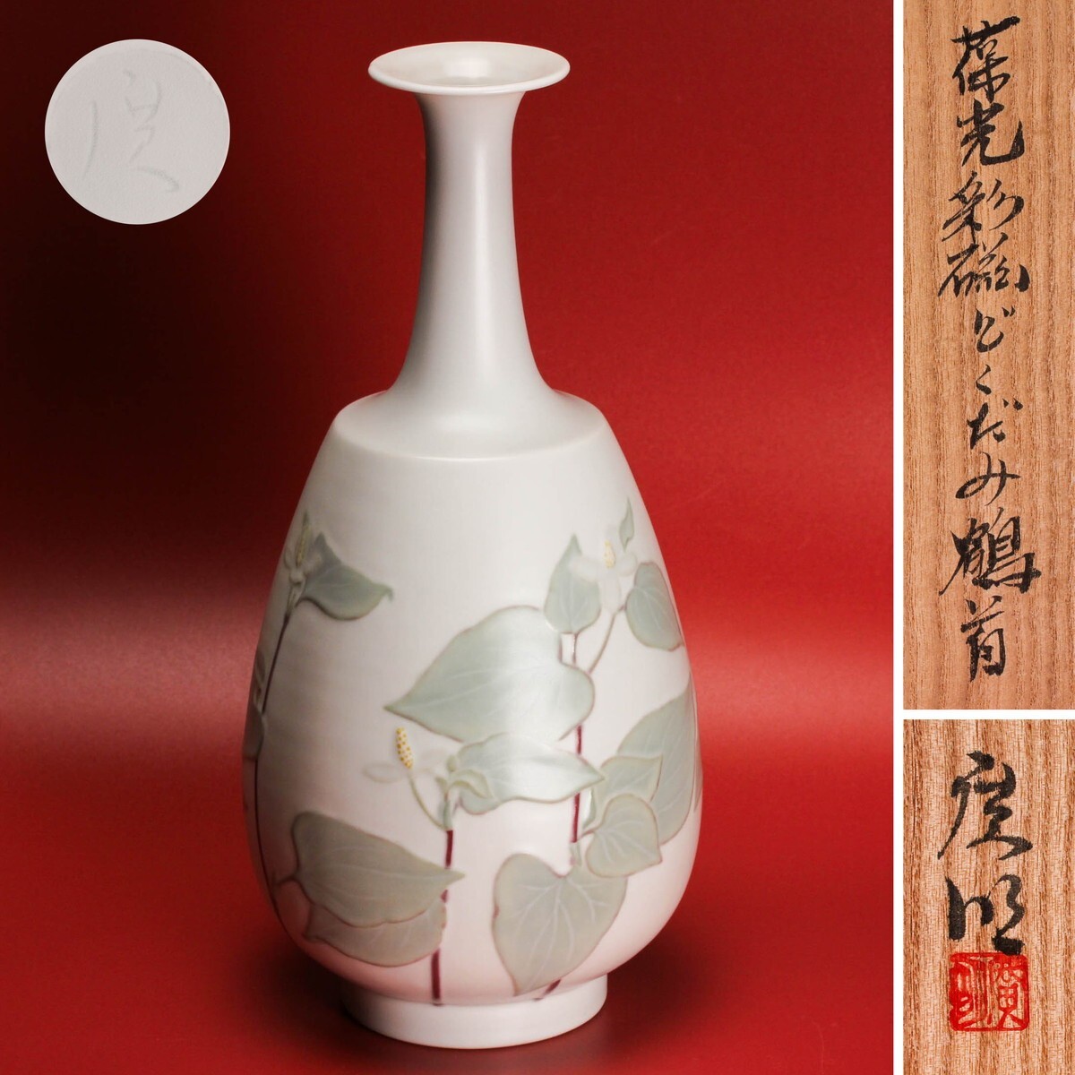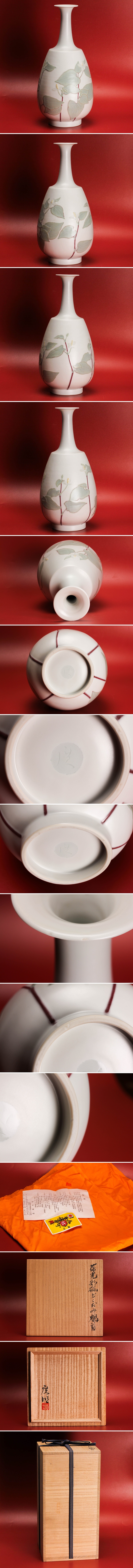 筒井廣明 葆光彩磁どくだみ鶴首花入 共箱 共布 栞 本物保証