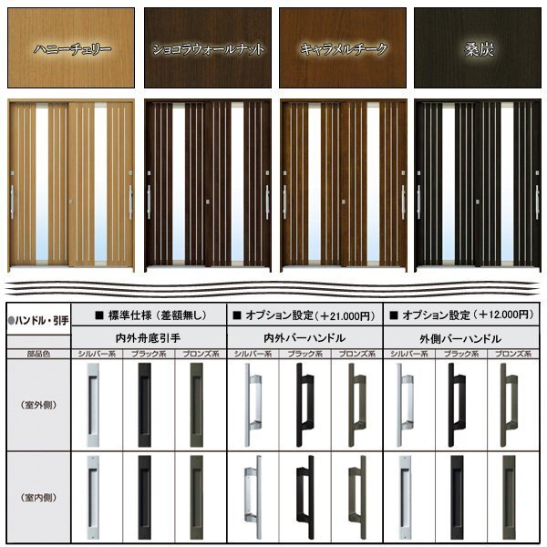 | ■ ハンドル仕様 | ■内外舟底引手 室外側:引手/室内側:引手 (基本仕様) 追加差額無し ------------------------------------------------------------------------- ■外側バーハンドル 室外側:バーハンドル/室内側:引手 (+12,000円) ■内外バーハンドル … 室外側:バーハンドル/室内側:バーハンドル (+21,000円) |