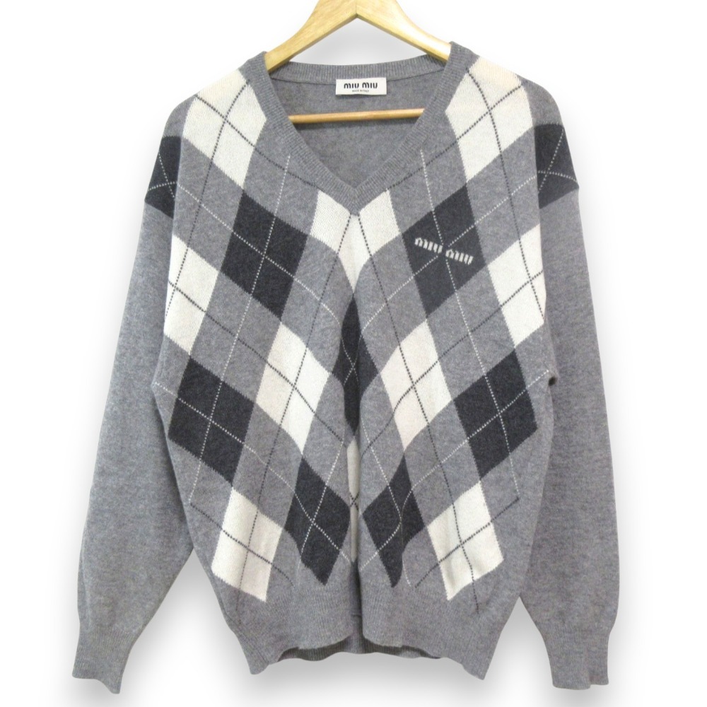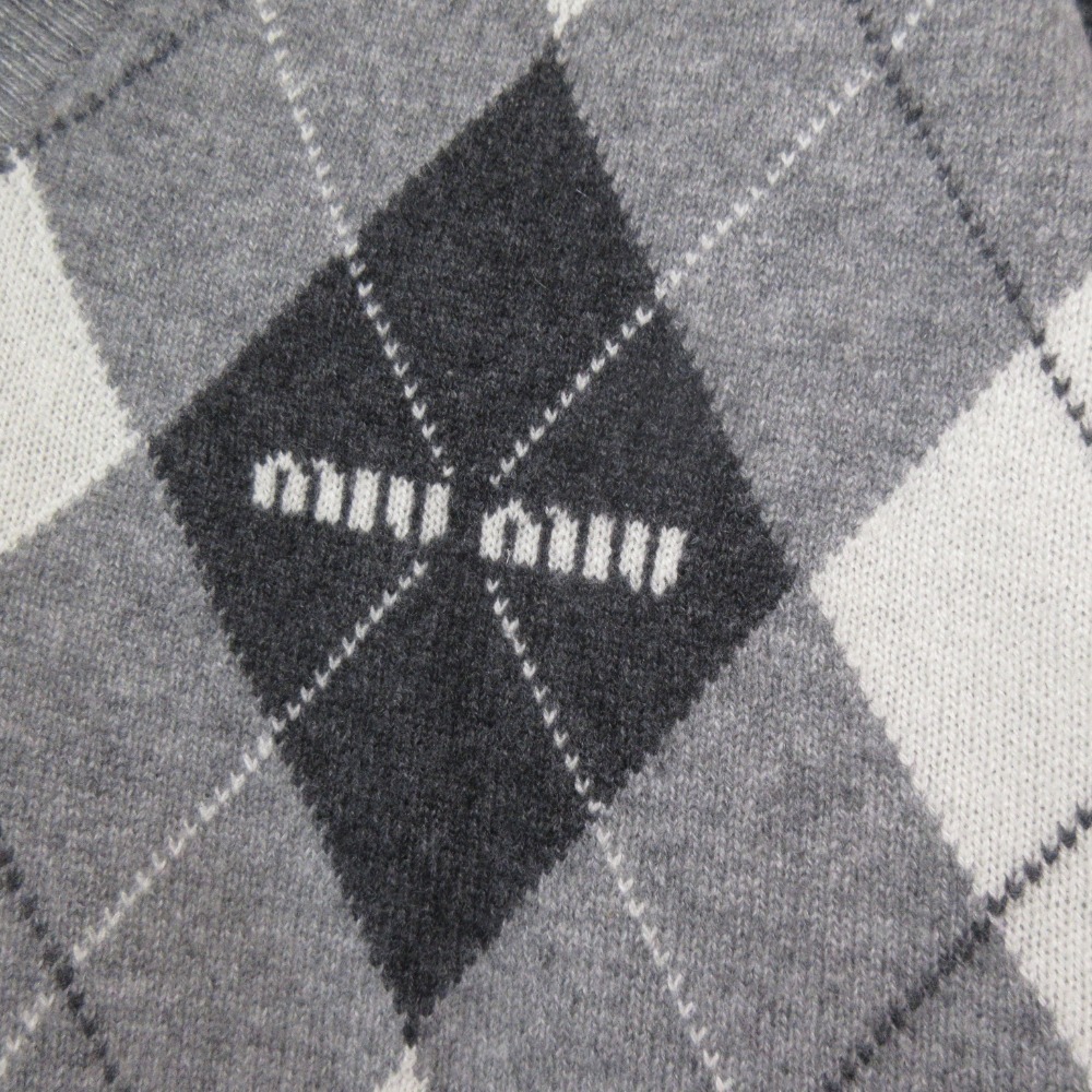美品 23AW MIUMIU ミュウミュウ アーガイルチェック Vネック カシミヤニット セーター サイズ36 グレー系