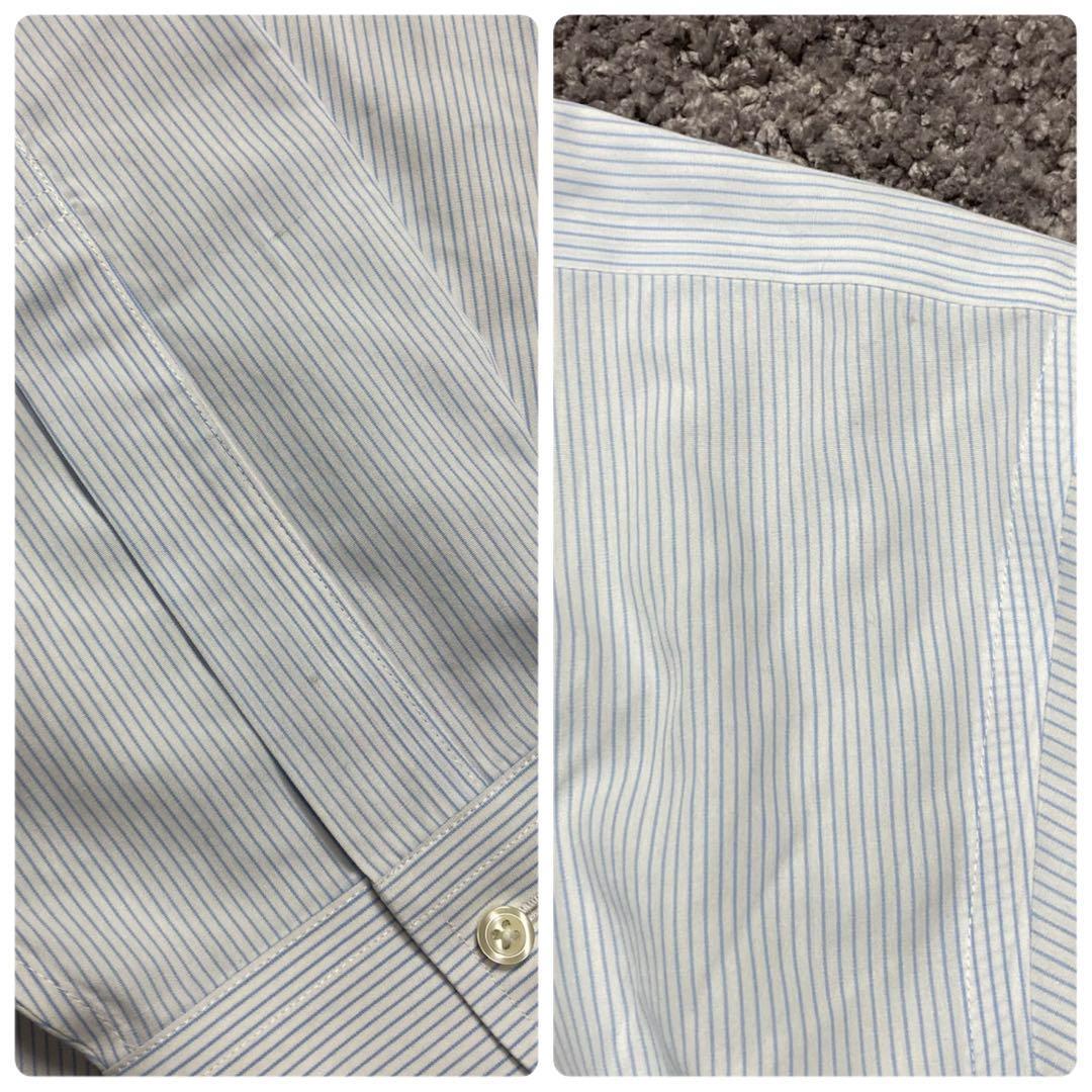 ●優しいサックスにブルーのストライプが映える上品なデザイン。仕立ての美しさと綿100%で着心地◎