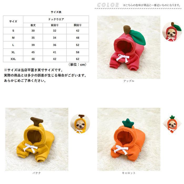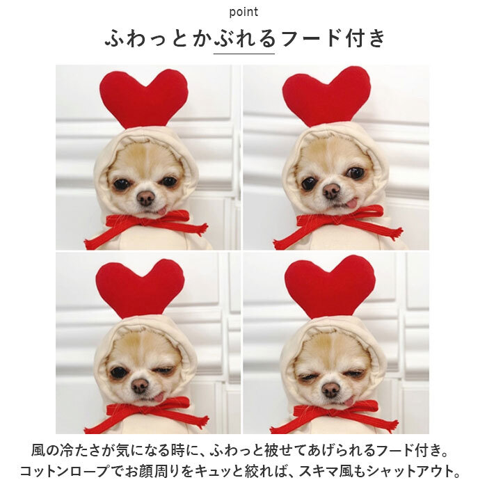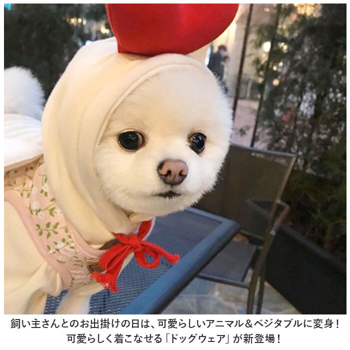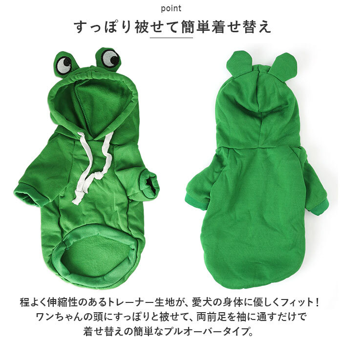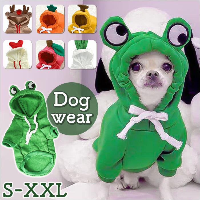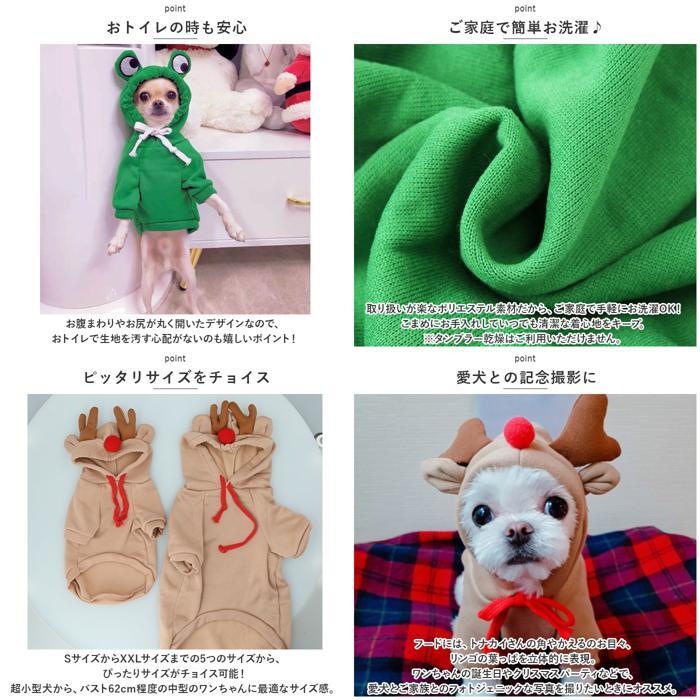 | 商品説明 | ・・飼い主さんとのお出掛けの日は、可愛らしいアニマル&ベジタブルに変身!可愛らしく着こなせる「ドッグウェア」が新登場! ・【肌寒い季節にお出掛けに】 ・表側は肌触りの柔らかいトレーナー生地に、裏地はふんわり起毛素材仕上げ。ウェア内側の暖かな空気をキープして、肌寒い時期でもほっこり快適。 ・【すっぽり被せて簡単着せ替え】 ・程よく伸縮性のあるトレーナー生地が、愛犬の身体に優しくフィット!ワンちゃんの頭にすっぽりと被せて、両前足を袖に通すだけで着せ替えの簡単なプルオーバータイプ。 ・【ふわっとかぶれるフード付き】 ・風の冷たさが気になる時に、ふわっと被せてあげられるフード付き。コットンロープでお顔周りをキュッと絞れば、スキマ風もシャットアウト。 ・【おトイレの時も安心】 ・お腹まわりやお尻が丸く開いたデザインなので、おトイレで生地を汚す心配がないのも嬉しいポイント! ・【ご家庭で簡単お洗濯♪】 ・取り扱いが楽なポリエステル素材だから、ご家庭で手軽にお洗濯OK!こまめにお手入れしていつでも清潔な着心地をキープ。(※タンブラー乾燥はご利用いただけません。) ・【ピッタリサイズをチョイス】 ・SサイズからXXLサイズまでの5つのサイズから、ぴったりサイズがチョイス可能!超小型犬から、バスト62cm程度の中型のワンちゃんに最適なサイズ感。 ・【愛犬との記念撮影に】 ・フードには、トナカイさんの角やかえるのお目々、リンゴの葉っぱを立体的に表現。ワンちゃんの誕生日やクリスマスパーティなどで、愛犬とご家族とのフォトジェニックな写真を撮りたいときにオススメ。 |