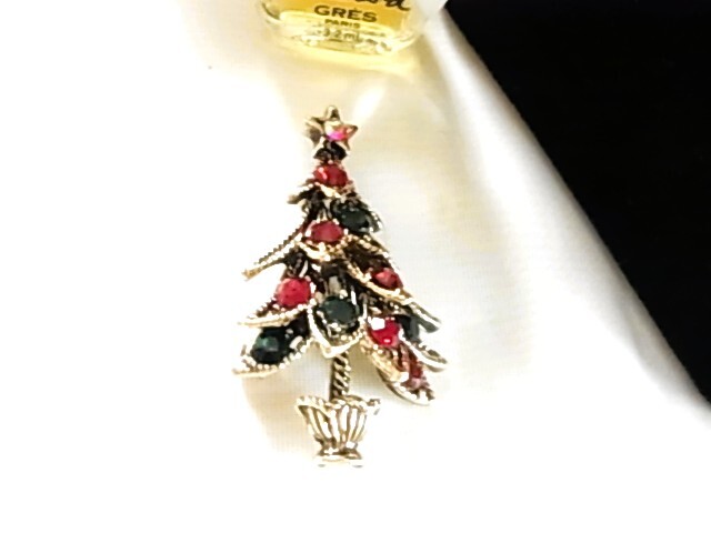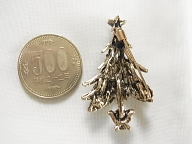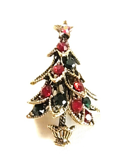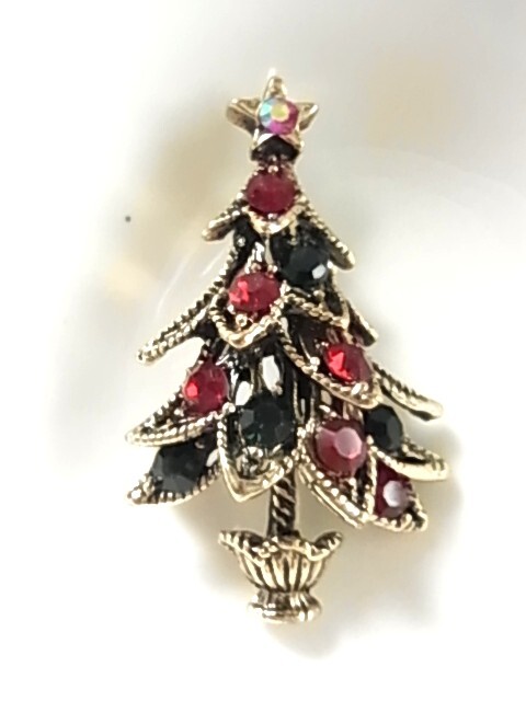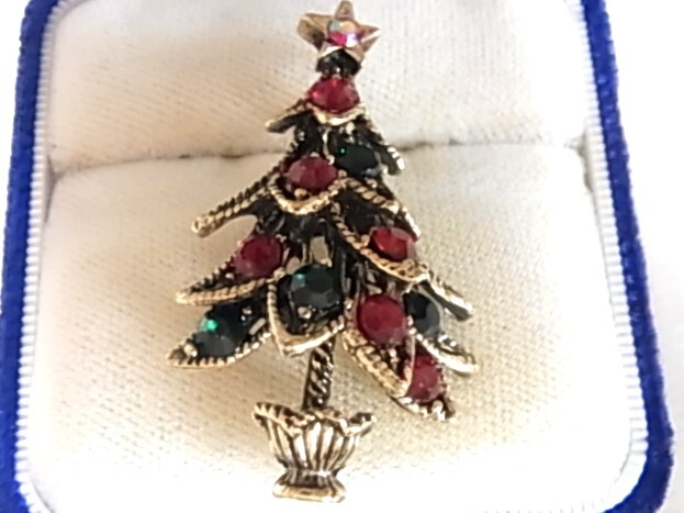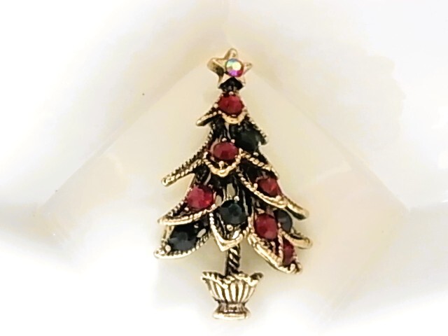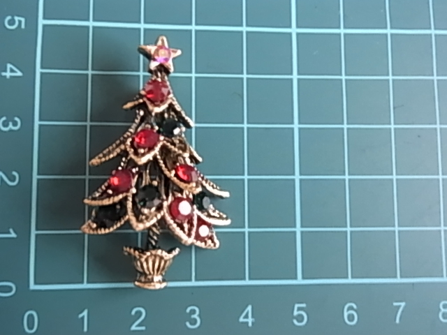 新品未使用品 クリスマスツリーモチーフ ルビートーンとエメラルドグリーントーンのイミテラインストーン 星はオーロラ調色のブローチ♯