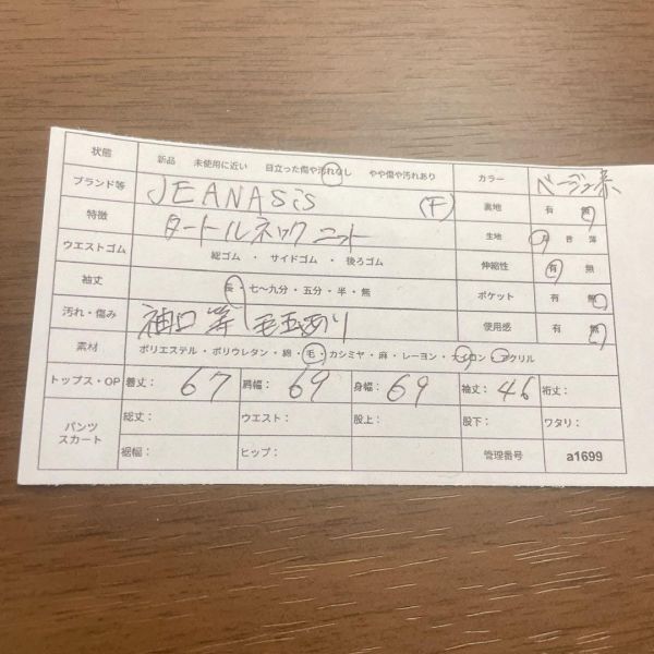 ゆるシルエットが大人可愛い JEANASISのタートルネックニット - ブランド:JEANASIS(ジーナシス) - アイテム:タートルネックニット セーター - サイズ表記:F(フリーサイズ) - カラー:ベージュ(ナチュラル系) - 素材:アクリル69%、ナイロン23%、毛8% - 特徴:ゆったりとしたビッグシルエットでこなれ感◎ やわらかタートルで首元も暖かい♪ - ダメージ・汚れ詳細:袖口に若干毛玉あり(全体的には良好) - 状態:目立った傷や汚れなし 管理番号:a1699
