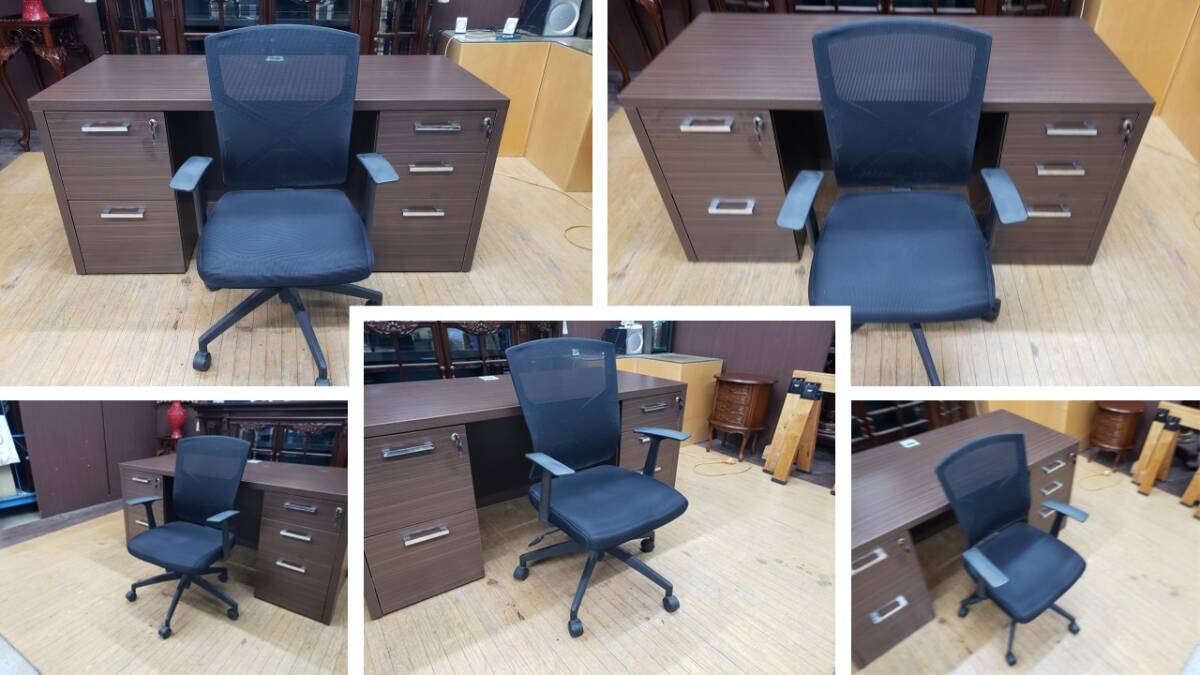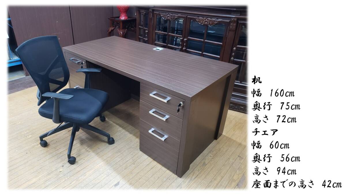 【状態】全体的に特記すべき欠点等も無く綺麗状態です。機能的には問題ありません。写真をよくご覧になって判断をお願い致します。USEDとなります。画像をご覧になる環境により実際の色と若干の違いがあるかも知れませんがご了承下さい。 【サイズ】 机 幅160㎝ 奥行き75㎝ 高さ72㎝ チェア 幅60㎝ 奥行き56㎝ 高さ94㎝ 座面までの高さ42㎝