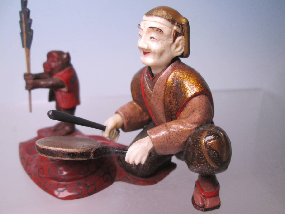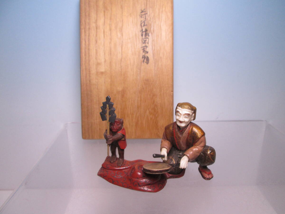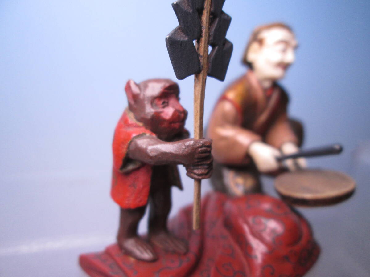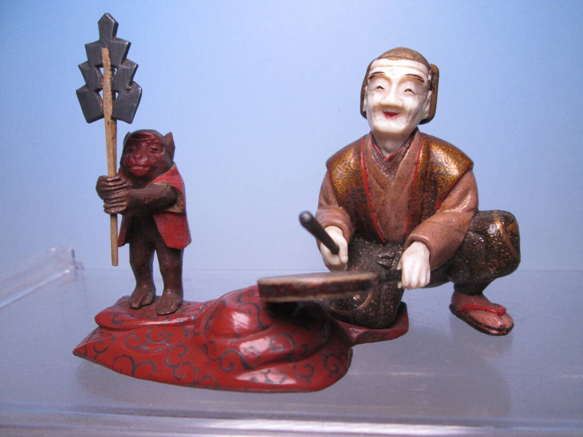 ☆素晴らしい細工 金蒔絵 猿回し図 置物 木箱付 古美術
