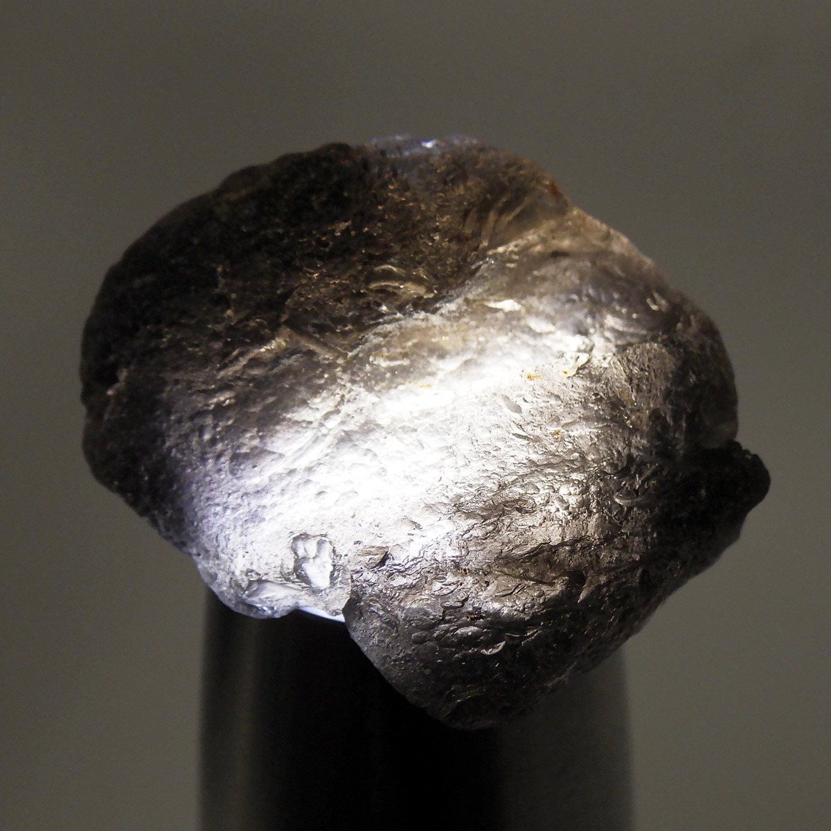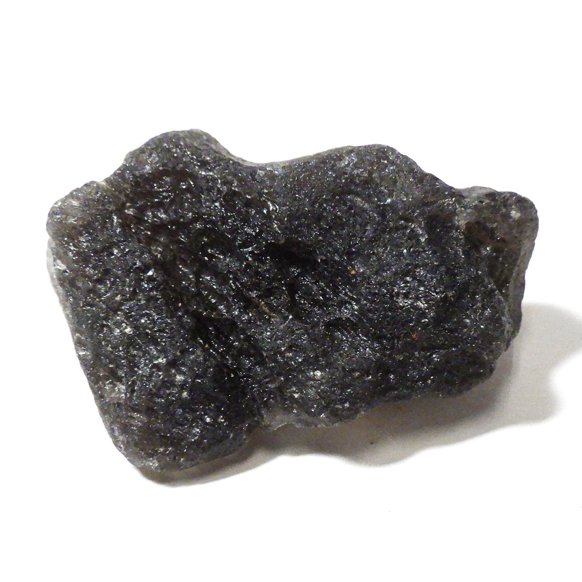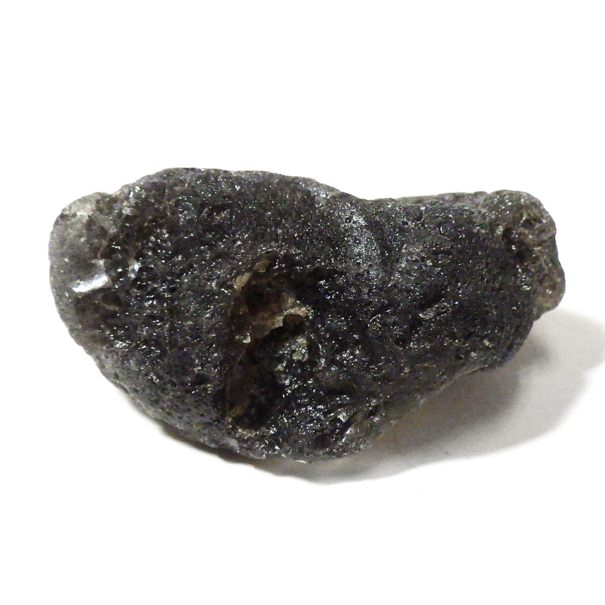 インドネシア・ジャワ島で採掘される希少な天然ガラスであるアグニマニタイトの原石です。アグニマニタイトの石の名前は、サンスクリット語で「火の神」を意味するアグニと「宝石」を意味するマニに由来し、「火の宝石」として知られています。表面はマットな黒~グレーの質感で、ごつごつとした天然のテクスチャが魅力的。光に透かすと、ほんのりスモーキーで神秘的な雰囲気を放ちます。フォルムや質感が面白い原石です。鉱物コレクションやお守り、アクセサリー制作にもおすすめです。