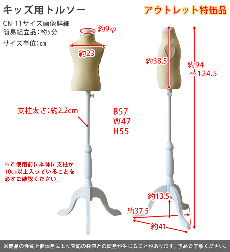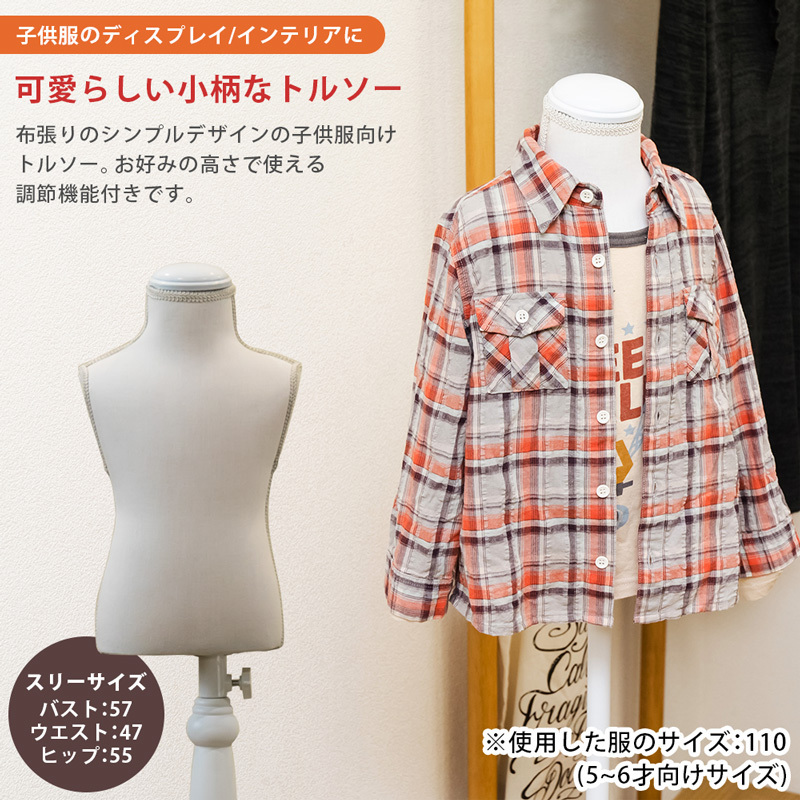 | 商品説明 | 簡易組み立て品(約5分) ※こちらはアウトレット特価品になります。 表面のボンド汚れやはみ出し、 ほつれなどが目立つ物がございます。予めご了承下さい。 子供服のディスプレイ・インテリアにぴったりのキッズサイズトルソー! お好みの高さで使える調節機能付きです♪ 布張りのシンプルデザインで使いやすい、子供服向けのコンパクトなトルソー。 本体は高さ調節機能付き、飾り方や好みに応じた調節が行えます。 カラーは優しい風合いの3色、様々な種類の衣類と馴染みます。 |