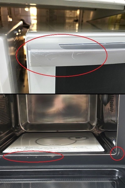 持ち手部分にスレキズ、庫内入口にスレキズがあります。(写真2枚目)